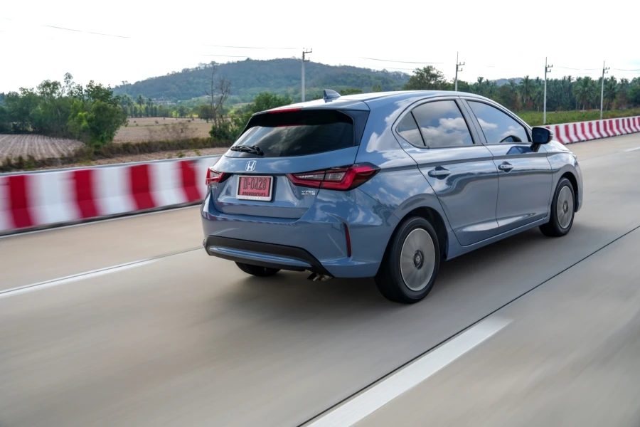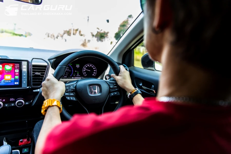จุดเริ่มต้นของทริปทดสอบขับ ฮอนด้า ซิตี้ แฮทช์แบ็ก ใหม่ เป็นการตอกย้ำสมถรรนะและอรรถประโยชน์อีกครั้งด้วยรูปลักษณ์ที่สดใหม่และคุ้มค่ากว่าที่เคยด้วยรุ่น e:HEV SV ซึ่งผู้เขียนได้ขับรุ่นนี้พอดีในเส้นทางขาไปกว่า 170 กม. โดยเริ่มสตาร์ทจากบริษัท ฮอนด้า ออโตโมบิล (ประเทศไทย) จำกัด ในนิคมอุตสหกรรมบางชัน เสรีไทย 87 มุ่งหน้ามอเตอร์เวย์ ชลบุรี-พัทยา และตัดมาใช้ทางหลวงหมายเลข 331 เพื่อไปแวะจุดถ่ายรูปในท่าอากาศยานนานาชาติอู่ตะเภา และไปพักกลางวันที่ร้ารแสมสารซีฟู๊ด ระหว่างทางมีทั้งขับและนั่งตำแหน่งผู้โดยสารตอนหน้า พอสรุปได้ว่า ฟังก์ชันใหม่การเชื่อมต่อสมาร์ทโฟนแบบไร้สายกับไอโฟนทำได้สะดวก ใช้กูเกิ้บแมพได้ดี เล่นเพลงสะดวก เมื่อมานั่งการปรับเบาะแบบมือเป็นสิ่งที่น่าแปลกใจอยู่ แต่ความทันสมัยบนพวงมาลัยกับฟังก์ชันต่างๆ ชดเชยได้ดี โดยเฉพาะ ACC กับ LSF ระบบควบคุมความเร็วอัตโนมัติแบบแปรผันพร้อมระบบปรับความเร็วตามรถยนต์คันหน้าที่ความเร็วต่ำ นอกจากนี้จังหวะที่ขับเข้าใกล้รถใหญ่บนทางเปิดโล่งของเส้น 331 ก็ได้มีโอกาสเห็นระบบเตือนการชนพร้อมระบบช่วยเบรก CMBS ทำงาน และเมื่อขับเข้าเขตตัวเมืองที่มีแยกสัญญานไฟก็ชอบระบบเตือนเมื่อรถคันหน้าเคลื่อนที่ ช่วงแรกของการขับรุ่น e:HEV SV ได้อัตราสิ้นเปลืองบนหน้าจอแสดงข้อมูลการขับแบบ TFT ขนาด 7 นิ้วอยู่ที่ 20 กม./ล. ซึ่งไม่ได้เน้นการทำตัวเลขประหยัดเป็นการขับตามสภาพจริงที่มีผู้โดยสารเต็มทุกที่นั่ง 4 จุดหน้า-หลังพร้อมสัมภาระ
