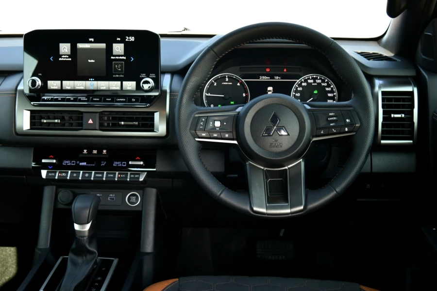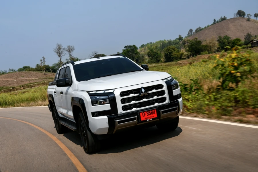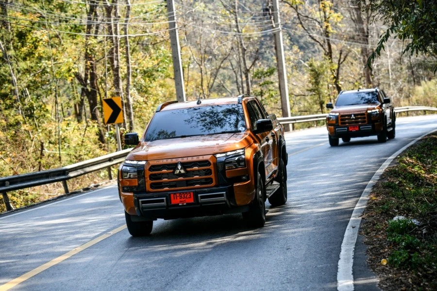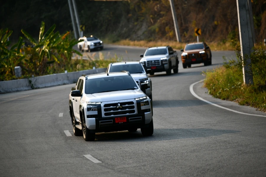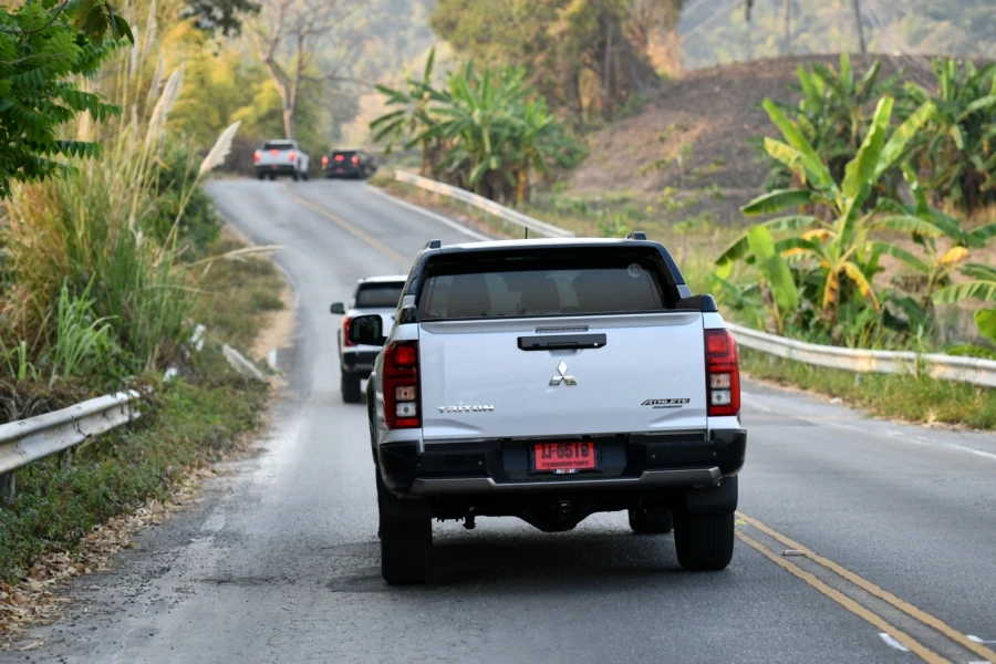 มิตซูบิชิ ไทรทัน แอทลีท ใหม่หมด กับทริปพิสูจน์สมรรถนะการขับทางไกล เส้นทางขุนเขาขึ้นลงทางลาดชันตลอดจนโค้งซ้าย-ขวาตลอดเส้นทางจากตัวเมืองเชียงใหม่สู่ดอยแม่สลองจังหวัดเชียงราย ผู้เขียนตัวแทนจากเพจ Carguru Thailand และเว็บไซต์ Checkraka.com ได้ร่วมทดสอบโดยจุดหมายแรกคือการขับในตัวเมืองใช้การนำทางโดยแผ่นที่จากการเชื่อมต่อกับสมาร์ทโฟนแบบไร้สายที่ให้ความสะดวกสบายและดูชัดเจน จริงๆ ตัวแผนที่ของรถก็มีให้ใช้งานเพราะมีการติดตั้ง eSIM เรียบร้อย สำหรับรุ่นรถที่ได้ขับเป็นรุ่นท็อป 4WD AT โดยมีรถร่วมทดสอบทั้งหมด 13 คัน ต่างสีกันแค่นั้น การเดินทางเป็นไปในรูปแบบขบวนคาราวาน เริ่มจากขับตามเส้นทางในเมืองผ่านการจราจรในช่วงสายวันจันทร์ที่ยังไม่พลุกพล่านมากนัก สัมผัสแรกที่ชอบคือ การตบอสนองของคันเร่งที่ทำได้ฉับไว การออกตัวทำได้ดีมาก ตลอดจนการเปลี่ยนเกียร์ในช่วงความเร็วต่ำสลับหยุดนิ่งก็ทำได้ดี เราใช้เวลาไม่นานก็มาถึงร้านอาหาร Celapot กัลเลอรี่ จนได้เวลาสมควรก็ออกเดินทางผู้เขียนสลับมาอยู่ในตำแหน่งผู้นั่งข้างคนขับ ช่วงนี้เป็นการเดินทางยาวสู่ร้านกาแฟ Gafre Cafe Club ที่อำเภอฝาง จังหวัดเชียงใหม่ พร้อมกับได้มีโอกาสเข้าไปสักการะอนุสาวรีย์พระเจ้าฝาง-พระนางสามผิว โดยระหว่างทางเป็นการขับขึ้นลงเขามาเกือบตลอด แซงผ่านรถช้าเป็นระยะซึ่งต้องอาศัยพละกำลังที่ดีจากเครื่องยนต์ Hyper PowerX2 ในการเร่งแซงอยู่บ่อยครั้ง ผู้เขียนที่นั่งมาตลอดช่วงนี้พอสรุปเบื้องต้นในมุมของคนนั่งได้ว่า ภายในห้องโดยสารเงียบดี แทบไม่ได้ยินเสียงรบกวนจากภายนอกและบนพื้นผิวถนน ตลอดจนเสียงการทำงานของเครื่องยนต์ก็ไม่ดังเข้ามามากเหมือนทั่วไป อย่างไรก็ตามที่อยากให้ปรับปรุงคือ ตัวเบาะรองนั่งหนาจนดันต้นขาลอย (ผู้เขียนสูง 172 ซม.) ซึ่งผู้ขับที่เปลี่ยนมาสลับก็เห็นพ้องเช่นกันว่าหนาไปและปรับขึ้นลงไม่ได้อีก ทำให้องศาเข่าเวลานั่งนานๆ รู้สึกเมื่อยเพราะเบาะรองนั่งค่อนข้างชันและสั้น โดยเบาะด้านข้างผู้ขับเป็นแบบปรับมือ แต่ด้านผู้ขับเป็นปรับไฟฟ้าไม่ค่อยรู้สึกมากนักเพราะตำแหน่งการขับที่ต้องวางเท้าไว้ที่คันเร่งและแป้นเบรก
