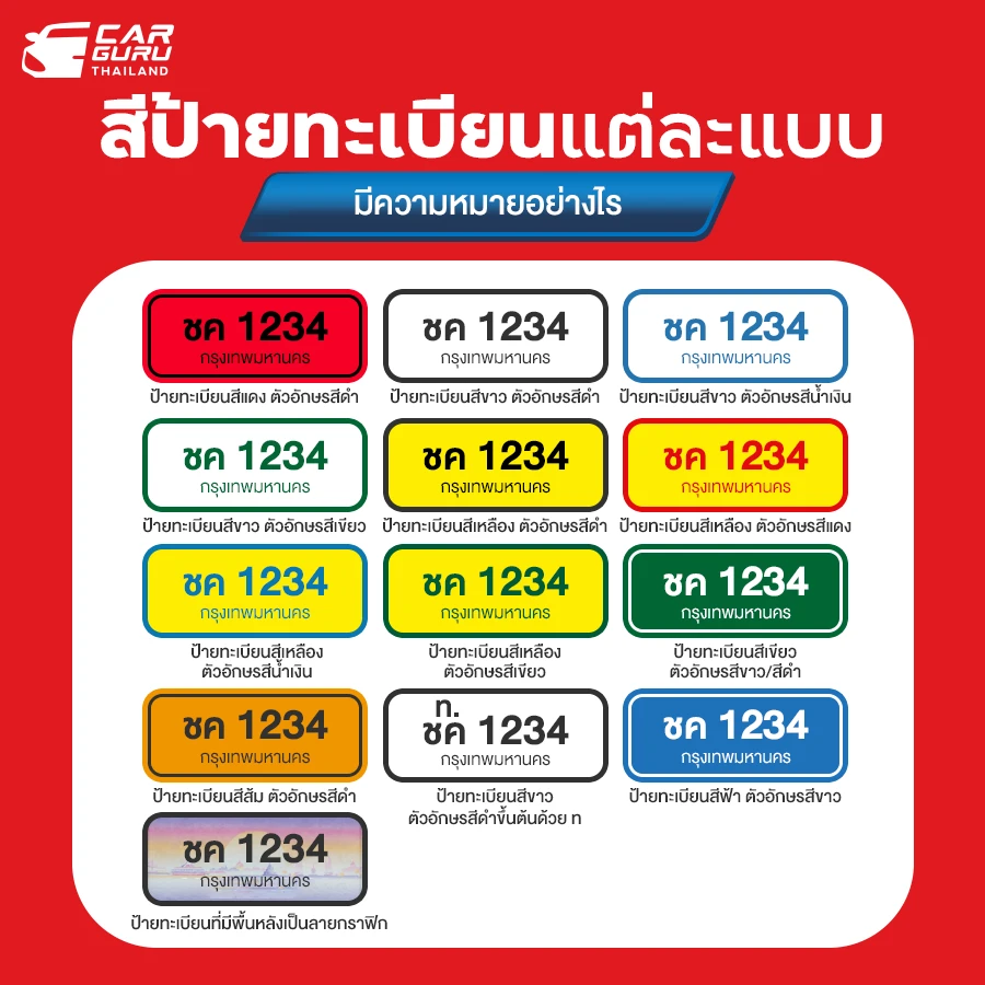 ซึ่งก็มีการแบ่งประเภทตามสีป้ายทะเบียนเอาไว้ ซึ่งแต่ละสี และรูปแบบมีความหมายที่แตกต่างกัน รวมถึงประเภทของรถยนต์คันนั้น ๆ ด้วยโดยมีรายละเอียด ดังนี้