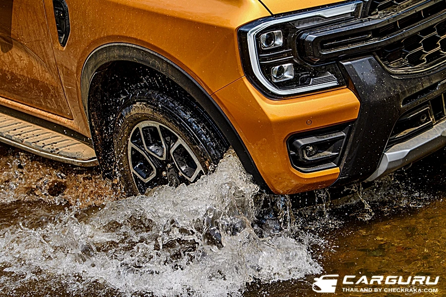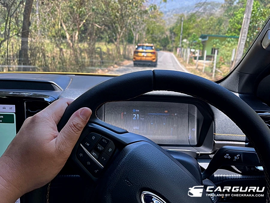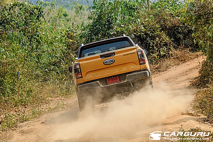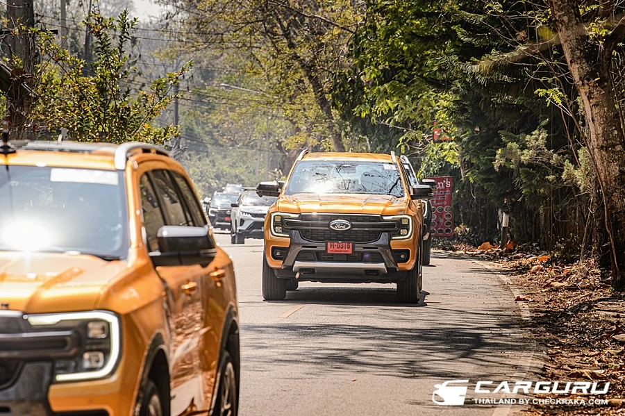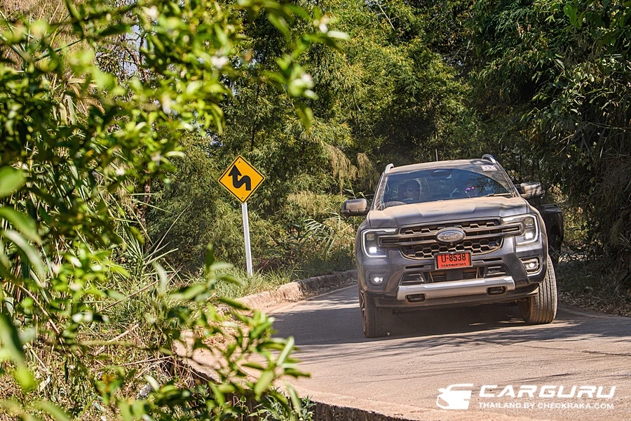 ช่วงความเร็วสูงป้องกันเสียงลมปะทะได้ดี เสียงจากพื้นถนนหรือเสียงยางใต้ท้องรถแม้เสียงเครื่องยนต์ก็ดังเข้ามาน้อยมาก ส่วนระบบช่วงล่างโช๊คอัพแบบ โมโนทูป นั้นหนึบแน่น เข้าทางโค้งในเขาได้แม่นยำและนิ่งแบบมั่นใจได้ มีกระเด้งเบา ๆ แม้ด้านหลังยังใช้แหนบและยางแก้มเตี้ยขนาด 255/55R20 แต่ให้ความนุ่มนวลไม่ต่างจาก Wildtrak รุ่นที่ใช้ยางแก้มหนาขนาดขอบ 18 นิ้ว