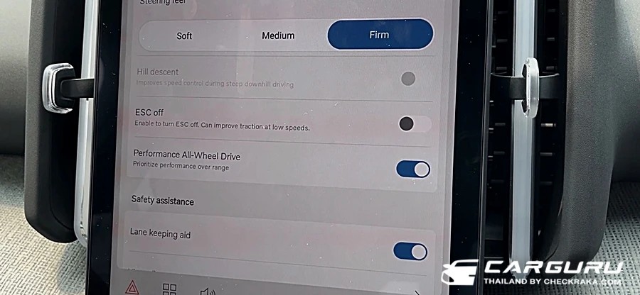 การควบคุมพวงมาลัย นิ่งและคมกระชับ สามารถเลือกปรับน้ำหนักได้ 3 ระดับ Soft, Medium และ Firm น้ำหนักจะแตกต่างกันทีละน้อยในการปรับขึ้นตามลำดับ แต่ถ้าปรับจาก Soft ไปที่ Firm นั่นคือรู้สึกได้ชัดเจนว่า หนักและหนืดขึ้น แต่ไม่หนักแบบรถพวงมาลัยหนักนะครับ แค่ขับแล้วมั่นใจกว่า ไม่เบาหวิวเกินไปถือว่ากำลังดี และสามารถปรับน้ำหนักตามความเร็วต่าง ๆ อีกเล็กน้อย เช่น Firm ขับความเร็วต่ำ ๆ การจอด ถอย ก้จะเบาขึ้นมานิดนึง (แทบไม่รู้สึก) ส่วนถ้าเลือก Soft เมื่อเร่งออกตัวแบบทันทีพวงมาลัยเพิ่มความตึงให้ปลอดภัยขึ้น