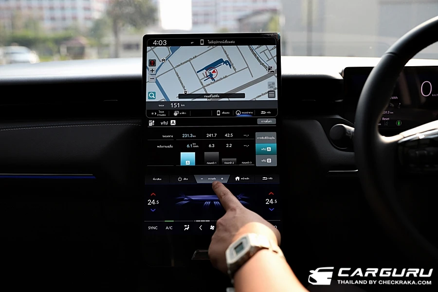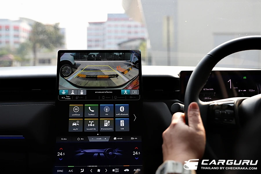 ในส่วนตรงกลางเป็นระบบการทำงานต่าง ๆ ของตัวรถ ระบบช่วยเหลือการขับขี่ และส่วนบนสุดคือ แผนที่ การเชื่อมต่ออุปกรณ์สมาร์โฟน รองรับ AppleCarPlay แบบไร้าย และ Android Auto ที่ต้องใช้เสียบสายอยู่ และแสดงภาพจากกล้องถอยหลัง ที่ยังคงไม่ค่อยชัดเจนมากนัก ส่วนตัวคิดว่าตัวจอกลางใช้งานได้สะดวกง่ายขึ้นกว่าที่ต้องเข้าไปเมนูลึกหรือต้องกดสลับหน้าจอไปมา ส่วนระบบเสียงให้ลำโพง 8 ตำแหน่งอีกด้วย
