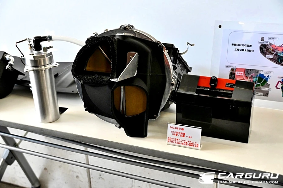 ติดตั้งอุปกรณ์ดูดซับ CO2 เข้าที่จุดดูดอากาศของแอร์คลีนเนอร์ พร้อมกับติดตั้งอุปกรณ์แยกCO2 ที่เกิดขึ้นจากความร้อนของน้ำมันเครื่องเข้าที่ด้านข้างของอุปกรณ์ดังกล่าว เพื่อกู้คืน CO2 ที่แยกตัวออกมาเก็บไว้ในถังขนาดเล็กที่เต็มไปด้วยน้ำยาดูดซับ ในการแข่งขัน Fuji 2023 สนามสุดท้าย ได้ติดตั้งระบบสลับเปลี่ยนการดูดซับและแยกตัว CO2 เป็นแบบแมนนวล ในครั้งนี้ ได้เปลี่ยนมาใช้ระบบอัตโนมัติสำหรับการเปลี่ยนโปรเซสการดูดซับและแยกตัว โดยการหมุนฟิลเตอร์ดูดซับ CO2 อย่างช้า ๆ ในระหว่างการขับขี่