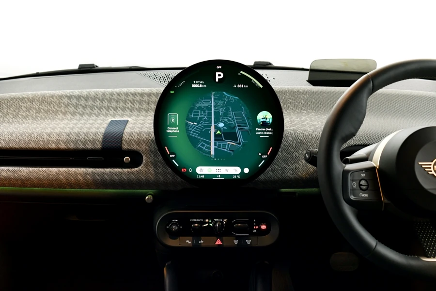 มินิ ใหม่ กับหน้าจอแสดงผล OLED ทรงกลม ภาพความละเอียดสูง คมชัด และมีฟังก์ชันการทำงานที่ครอบคลุมทุกการใช้งาน โดยหน้าจอแสดงผล MINI Interaction unit จะอยู่ที่บริเวณกึ่งกลางคอนโซลด้านหน้ารถ ซึ่งได้รับการออกแบบมาให้อยู่ใกล้กับตำแหน่งที่นั่งของคนขับมากขึ้น ขนาดเส้นผ่าศูนย์กลาง 240 มม. เพื่อให้สามารถใช้งานหน้าจอได้สะดวก นอกจากนี้ MINI Interaction Unit ยังทำงานบนระบบปฏิบัติการ MINI Operation System 9 ที่ตอบสนองการสั่งงานผ่านหน้าจอสัมผัสและการสั่งงานด้วยเสียงได้อย่างรวดเร็วและมีคุณภาพ หน้าจอจะแสดงผลข้อมูลที่จำเป็นสำหรับการขับอย่างครบครัน เช่น ความเร็ว ระดับพลังงานแบตเตอรี่ ฯลฯ สามารถเข้าถึงฟังก์ชันด้านการนำทาง มีเดีย โทรศัพท์ และการดูข้อมูลสภาพอากาศได้อย่างง่ายดายไม่ต่างกับการใช้งานสมาร์ทโฟน