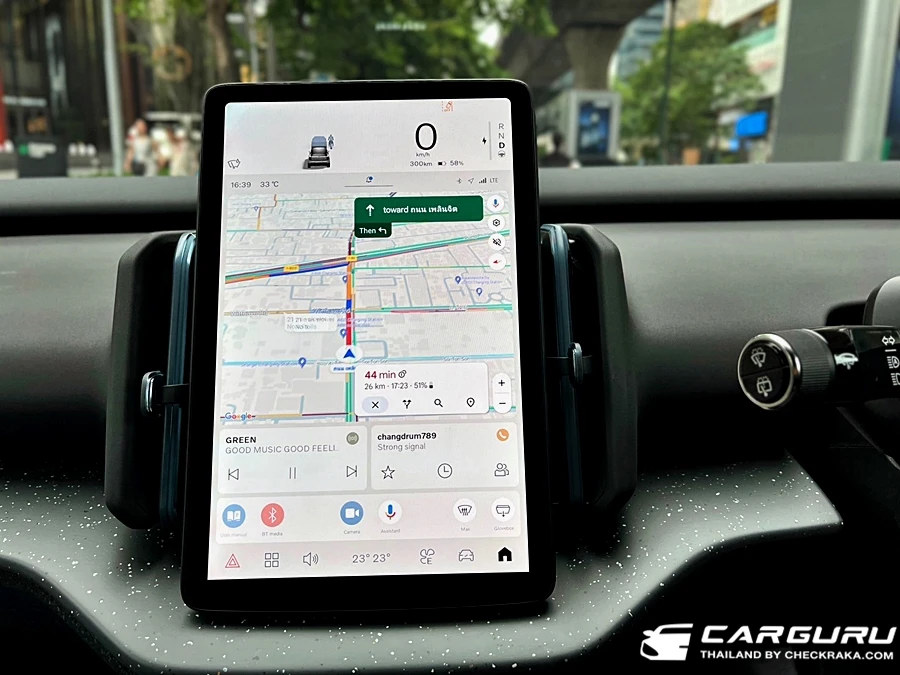 จากการที่ได้ทดลองใช้งานมาหลายวันต้องบอกว่าระบบการเชื่อมต่อของโทรศัพท์ นั้นค่อนข้างไม่คุ้นเคย เพราะบนจอจะมีระบบ "Google Built in" มาเสร็จสรรพ เพียงแค่ล็อคอินอีเมลเข้าระบบก็ใช้ได้ทันที ซึ่งจะแยกอิสระจากการใช้ google Map ในโทรศัพท์ ข้อดีคือ ไม่ต้องมาเชื่อมต่อมือถือ ในบางครั้งอาจต้องการความเป็นส่วนตัวในการรับสาย แต่บางครั้งการใช้แอปฯ ไลน์ในการโทรฯ อาจจะไม่โชว์ขึ้นบนจอ จะต้องกดรับที่โทรศัพท์เองและเลือกฟังผ่านลำโพงรถอีกที ส่วนการโทรศัพท์ด้วยเครือข่ายปกติ จะรับ-วางสายได้ด้วยปุ่มบนจอ ใครใช้ระบบโทรฯ ผ่านไลน์บ่อย ๆ อาจจะต้องหงุดหงิดเล็กน้อย ๆ และถ้าใช้คำสั่งในจนยังต้องใช้ภาษาอังกฤษอยู่