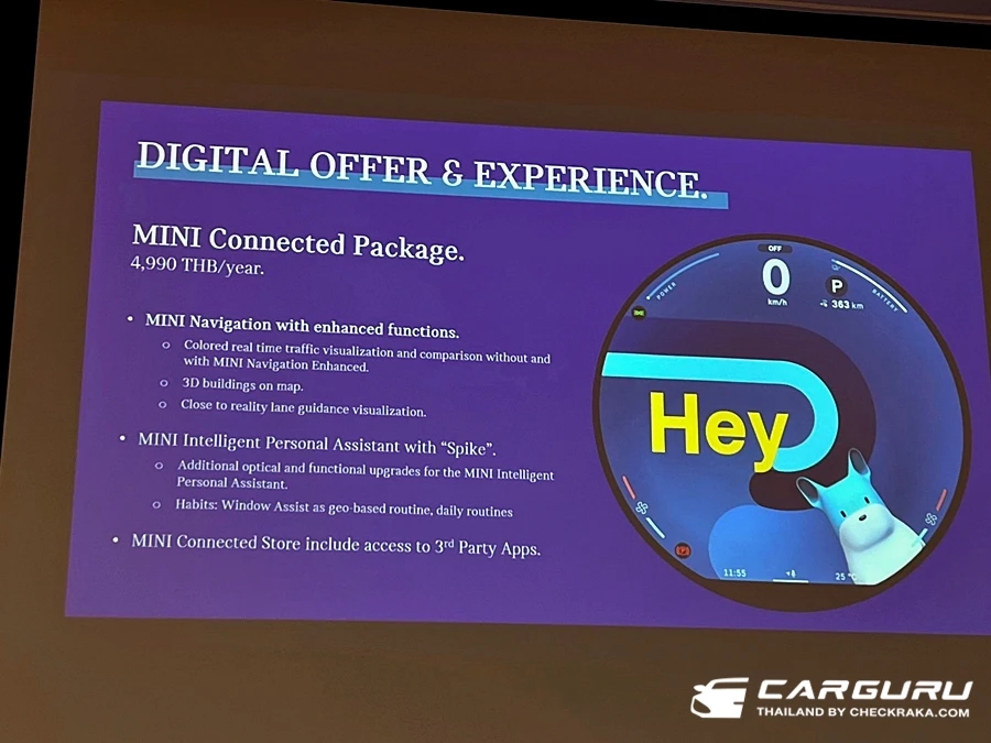 สามารถเลือก 3 รูปแบบ ได้แก่ Classic, Favoured และ JCW พร้อมหน้าจอ OLED ก็คือผู้ช่วยส่วนตัวอัจฉริยะ MINI Intelligent Personal Assistant ที่เปิดตัวเป็นครั้งแรกในไทย พร้อมตอบสนองทุกคำสั่ง เพียงออกเสียงเรียกว่า “Hey MINI!” หรือจะเลือกกดปุ่มสั่งการด้วยเสียงบนพวงมาลัยก็สะดวกไม่แพ้กัน ซึ่งนอกจากแค่การรับคำสั่ง MINI Intelligent Personal Assistant ยังสามารถปรากฏตัวทักทายคุณบนหน้าจอ MINI Interaction Unit ในรูปของรถ “MINI” ที่เป็นหน้าตาแบบมาตรฐาน หรืออาจเลือกอัปเกรดผ่านแพ็คเกจ MINI Connected ให้เป็นน้องหมา “Spike” ได้ด้วย