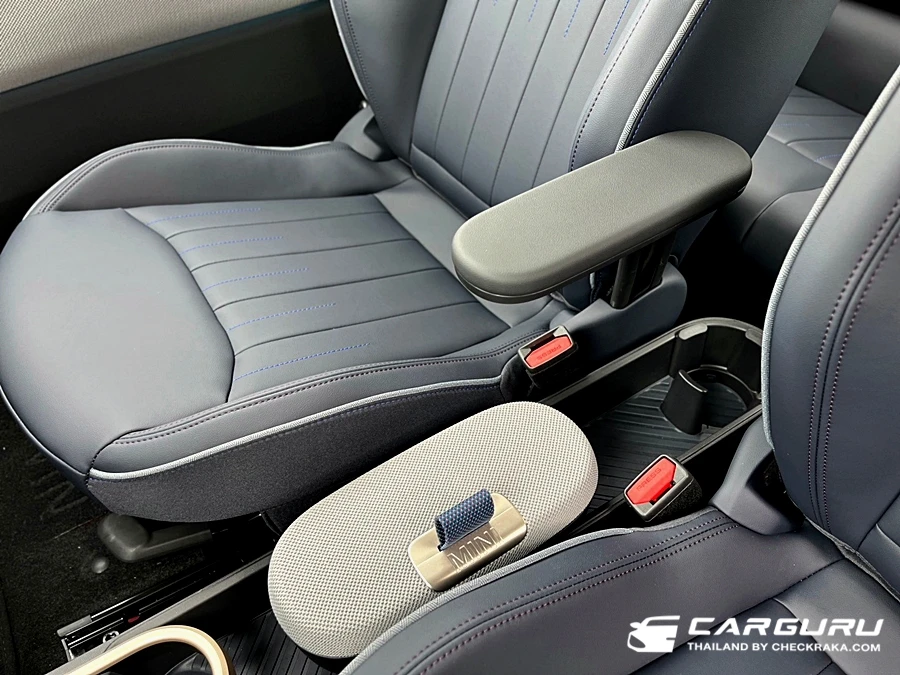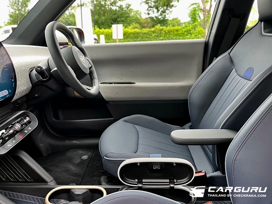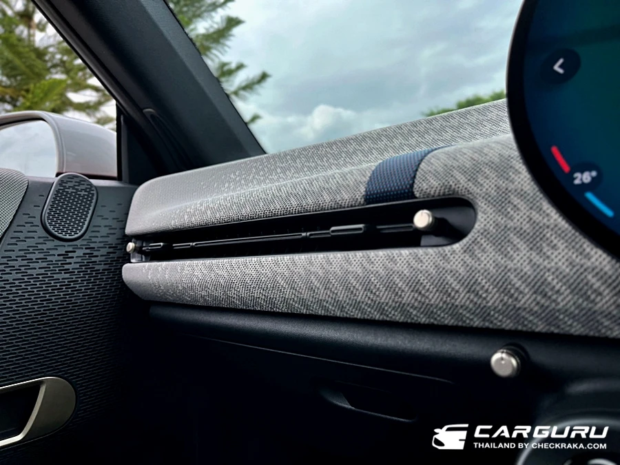 ภายในมินิมอลได้รับการออกแบบโดยคำนึงถึงความเรียบง่ายและความยั่งยืนควบคู่กัน โดยแผงหน้าปัด แผงประตู และฝาปิดช่องเก็บของต่าง ๆ ภายในรถล้วนผลิตจากเส้นใยโพลีเอสเตอร์รีไซเคิล 90% สวิตช์รวบคุมอยู่จอกลาง ขนาดใหญ่ แบ่งเป็น 3 ส่วน ส่วนบนแสดงการขับขี่ ความเร็ว ระยะทาง ระดับแบตฯ ส่วนกลางเป็นความบันเทิง และล่างสุดปรับระบบแอร์ กับปุ่มทางลัดเมนูต่าง ๆ และสวิตช์ใต้จอกลาง รองรับ Apple CarPlay / Android Auto แต่ถ้าใช้ Google map จอจะเหลือแนวยาวเท่านั้น ด้านบนและล่างจอจะดำ ให้ใช้งานแผนที่ติดรถจะดีกว่าเพราะบอกระดับแบตฯ คงเหลือเมื่อถึงปลายทางได้ด้วย