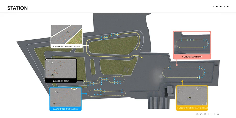 ในฐานนี้จะใช้ EX30 รุ่นขับสี่ Twin Motor Performance ที่ความเร็วต่าง ๆ ตั้งแต่ 50-60++ กม./ชม. จำลองสถานการณ์เหมือนมีกวางมูสที่ยืนขวางเลนรถของเราและต้องเบี่ยงหลบไปยังเลนสวน ขณะเดียวกันก็ต้องกลับเข้าเลนตัวเองเพราะรถสวนมาพอดี