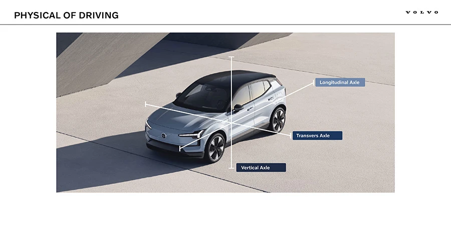 หนึ่งในสิ่งที่ควรรู้เบื้องต้นสำหรับการขับขี่รถยนต์คือ Physical of Driving ซึ่งเป็นหลักการของแรงที่เกิดขึ้นเมื่อขับขี่ในรูปแบบต่าง ๆ เช่น เมื่อเร่งความเร็ว EX30 รุ่น Twin Motor จะมีแรงขับเคลื่อนที่ล้อหลังมากกว่าด้านหน้า และน้ำหนักจะถ่ายเทไปด้านหลัง, การเบรคที่น้ำหนักจะถ่ายเทมาที่ด้านหน้า รวมถึงการเลี้ยวที่หากเลี้ยวซ้ายน้ำหนักจะถ่ายเทไปด้านขวา หากเลี้ยวขวาก็จะกลับกัน
