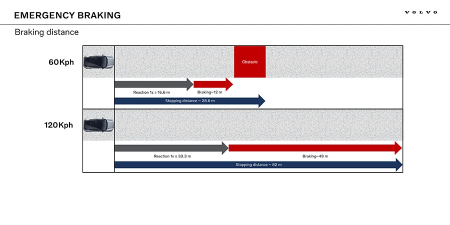 การอบรมครั้งนี้ยังกล่าวถึงการเบรคฉุกเฉิน (Emergency Braking) โดยปกติแล้ว คนทั่วไปจะมีระยะเวลาตอบสนองเท่า ๆ กันในทุกความเร็ว ดังนั้น เมื่อเราใช้ความเร็วเพิ่มขึ้น นั่นหมายความว่าเราจะต้องเผื่อระยะเบรคฉุกเฉินให้มากขึ้นด้วย ซึ่งเมื่อเป็นรถยนต์ไฟฟ้าที่มีน้ำหนักรถเฉลี่ยมากกว่ารถน้ำมันก็จะต้องเผื่อระยะให้มากขึ้น