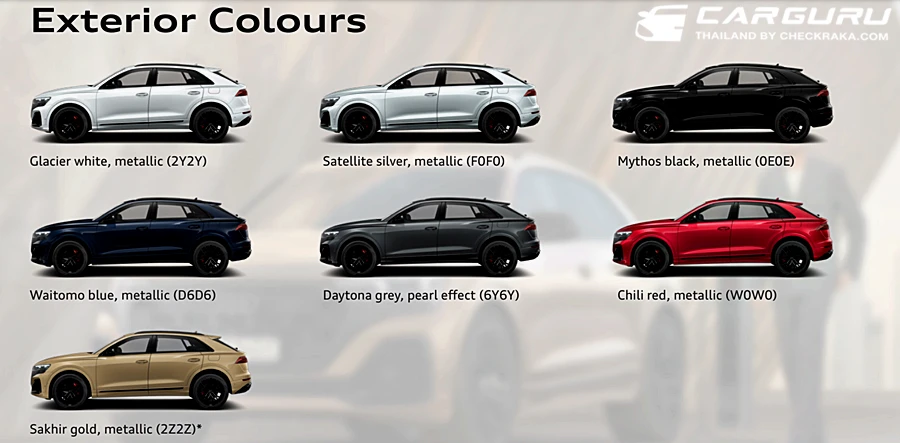 Audi Q8 TFSI e quattro S line edition one มีสีใหม่ให้เลือก คือ Sakhir Gold Metallic (Special color) Chili Red Metallic และ Waitomo Blue Metallic พร้อม 4 เฉดสียอดนิยมของแฟนอาวดี้ Glacier White Metallic / Satellite Silver Metallic / Mythos Black Metallicและ Daytona Grey Pearl Effect