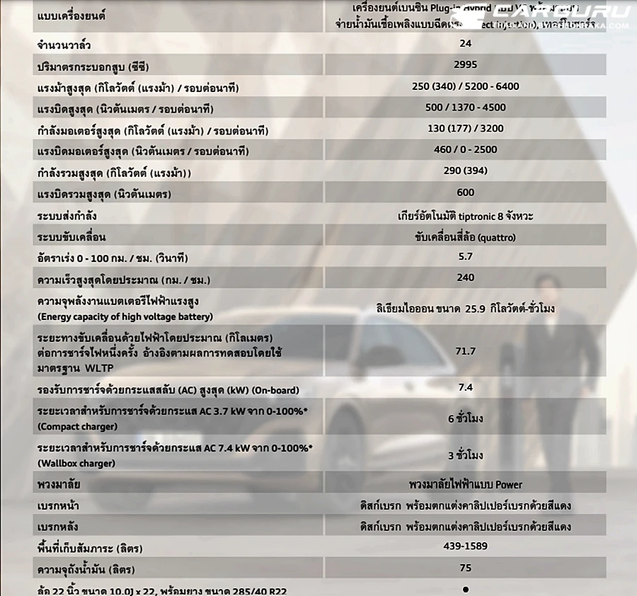 ขุมพลัง Plug-in Hybrid ใหม่เบนซิน V6 เทอร์โบ พลัง 340 แรงม้า 500 นิวตันเมตร ผสานมอเตอร์ไฟฟ้า 177 แรงม้า 460 นิวตันเมตร รวมทั้งสองระบบ 394 แรงม้า 600 นิวตันเมตร พร้อมระบบขับเคลื่อนสี่ล้อ quattro 0-100 กม./ชม. ใน 5.7 วินาที เพิ่มแบตเตอรี่ลิเธียมไอออนเป็น 25.9 kWh วิ่งไฟฟ้าล้วนได้ถึง 71.7 กม./ชม. WLTP ความเร็วสูงสุด 240 กม./ชม. รองรับ AC charger 7.4 kWh สามารถทำอัตราสิ้นเปลืองได้ดีขึ้นถึง 55.1 กม./ลิตร (จากเดิม 45 กม./ลิตร)