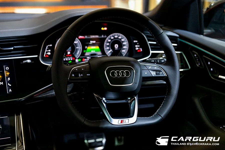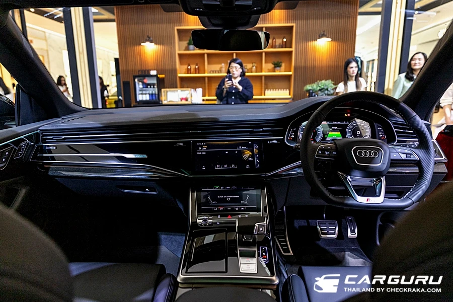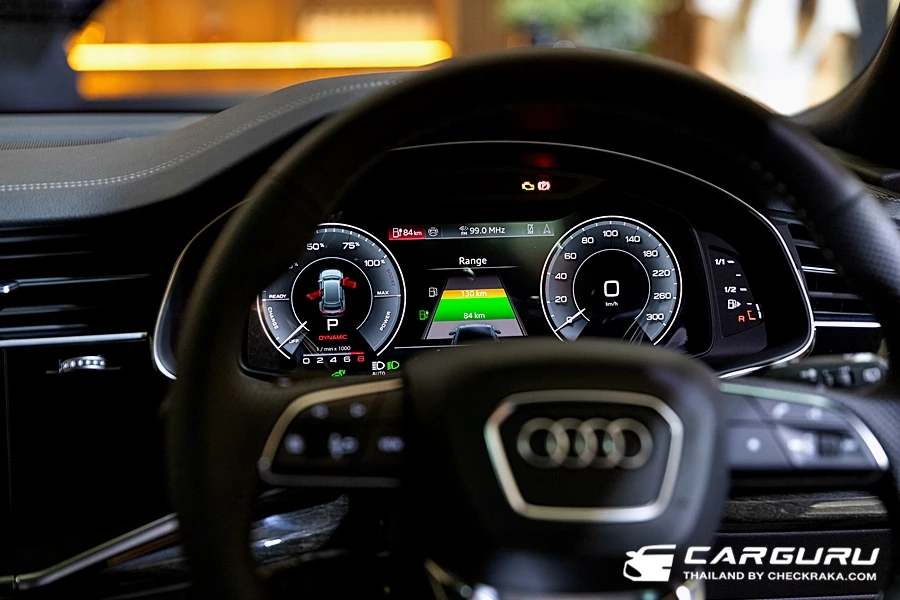 ภายในมาตรวัด Virtual cockpit ขนาด 12.3 นิ้ว จอกลาง MMI สัมผัสขนาด 10.1 นิ้ว พร้อมระบบเครื่องเสียงระดับพรีเมียม Bang & Olufsen และจอสัมผัสมัลติฟังก์ชั่นด้านล่างขนาด 8.6 นิ้ว สำหรับปรับระบบแอร์และการปรับปรับนั่ง เบาะนั่งหุ้มหนัง Valcona ติดตั้ง S line LED projector light