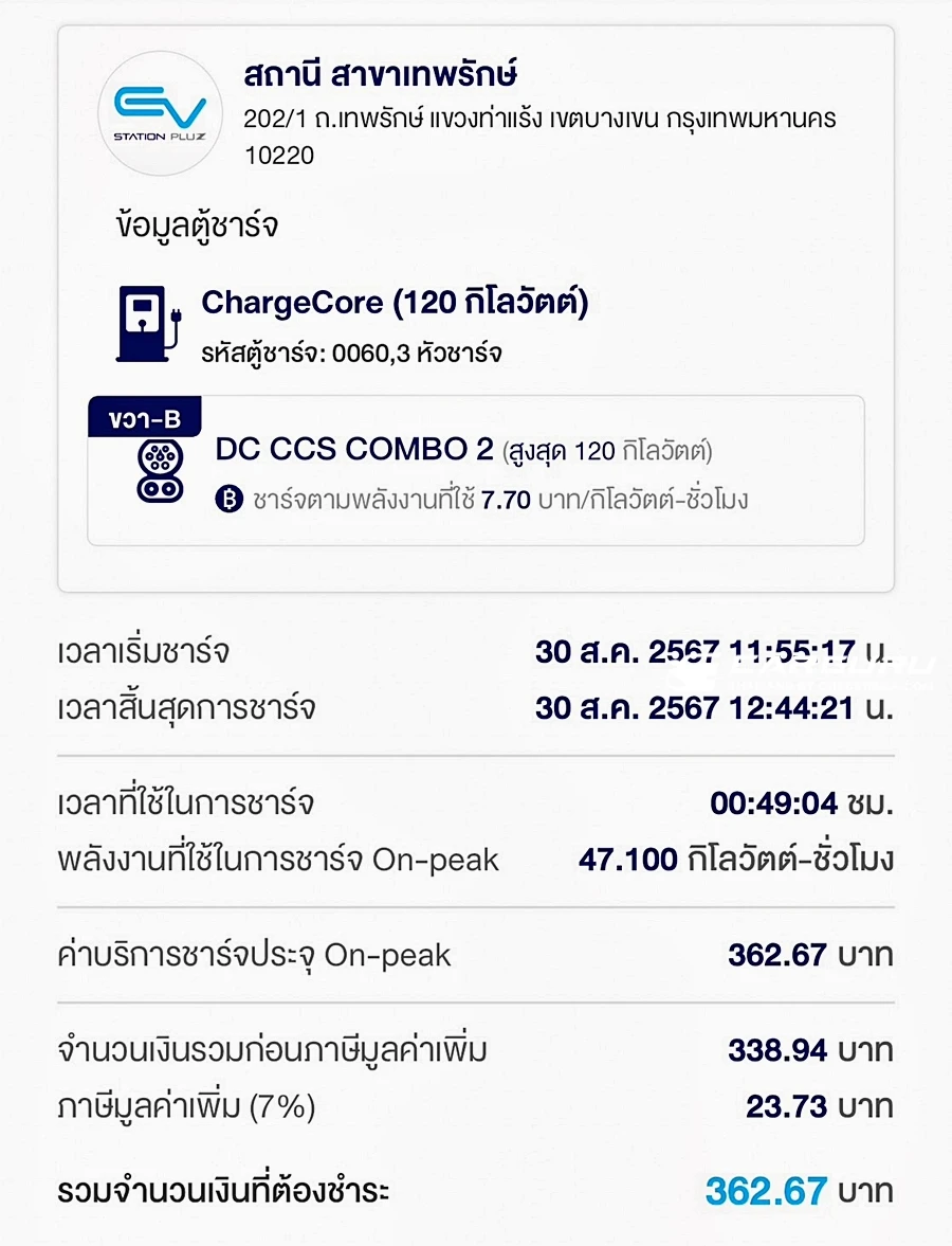 อัตราการกินไฟฟ้าสำหรับรถขนาดนี้ถือว่าไม่เกินเกินไปครับ จากตัวเลขบนมาตรวัดราว ๆ 20 kWh กับพลังระดับนี้นับว่าเหมาะสมไม่กินเกินไป และระยะที่วิ่งได้จริงจากวันที่รับรถมาทดสอบแบตเตอรี่ 99% ระะทางวิ่งได้ 533 กม. ขับไปกว่า 290 กม. ระดับแบตฯ ลดลงเหลือ 36% ระยะทางคงเหลือ 255 กม. นั่นคือสามารถวิ่งจริงประมาณ 500 - 540 กม. จากสเปคที่ระบุไว้ 549- 630 กม. (WLTP) sinv 620 กม. (NEDC) และเมื่อชาร์จไฟฟ้ากลับโดยตู้ชาร์จ PTT จาก 36 - 75% ระยะเวลา 50 นาที แวะกินข้าวสบาย ๆ พลังงานที่ใช้ 47.1 kWh (ตู้ชาร์จที่ใช้) จ่ายไป 362.67 บาทเท่านั้น อาจจะดูแพงเพราะสถานีชาร์จจะคิดอัตรา 7.70 บาท/kWh ตกกก.ละ 1 บาทกว่า ๆ ครับ สำหรับรถคันใหญ่สเปคดุดันอย่าง IX xDrive50 Sport คันนี้