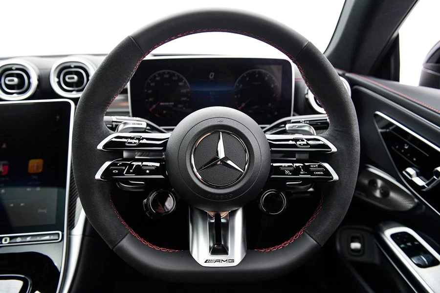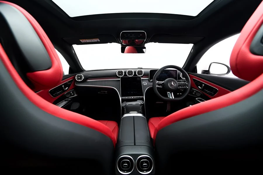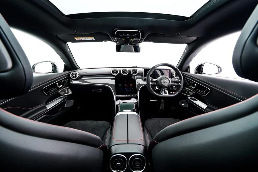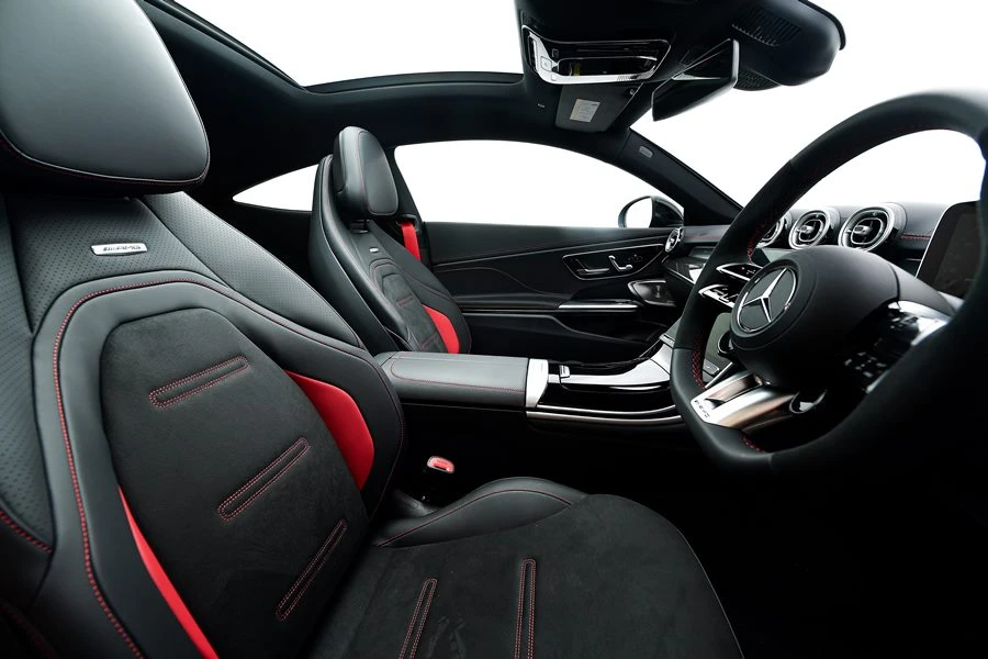 ภายในห้องโดยสารมอบรายละเอียดการตกแต่งที่โดดเด่นตามสไตล์สปอร์ตในทุกองค์ประกอบ ไม่ว่าจะเป็น พวงมาลัย AMG Performance steering wheel พร้อมระบบพวงมาลัย AMG Steering 3 สเตจ ติดตั้งเบาะนั่งหุ้มด้วยหนังและไมโครไฟเบอร์ ให้ความรู้สึกนุ่มสบายขณะโดยสาร มอบการขับขี่ที่เหนือกว่าด้วยระบบปฏิบัติการ MBUX Gen20x ที่ออกแบบมาตามรูปแบบโปรแกรม AMG ไม่ว่าจะเป็น