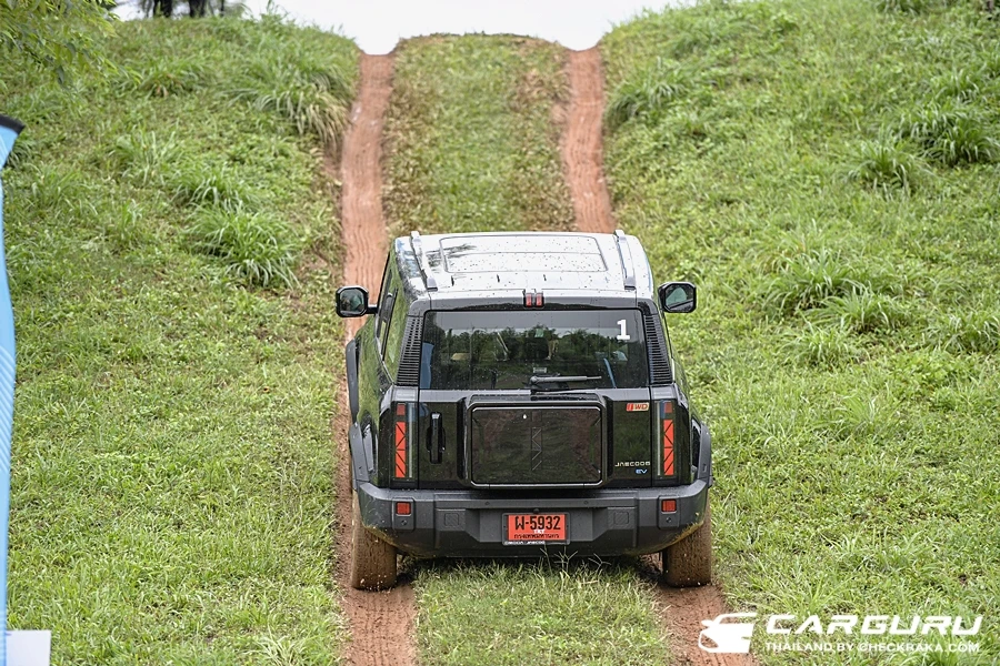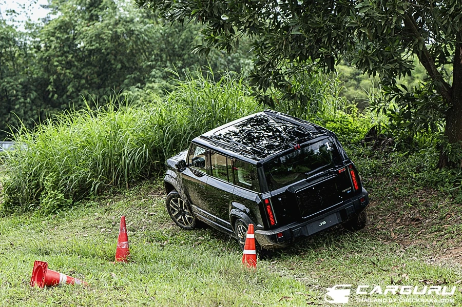 JAECOO 6 EV Long Range 4WD โดดเด่นเรื่องรูปทรงกล่อง ตัวถังอลูมิเนียมลดน้ำหนักตัวลงกว่า 30% ใต่ท้องสูงพอตัวขับผ่านเนินชันเนินสลับสบาย ๆ ส่วนหัวและท้ายสั้น หมดห่วงเรื่องมุมปีนและมุมจากเวลาเข้าป่า ระบบช่วยเหลือการขับขี่ในทางออฟโร้ดทำงานได้ดี มั่นใจในเทคโนโลยีเดียวกับใน Off Road Premium RandRover ลุยได้สบาย พละกำลังมอเตอร์ไฟฟ้าแรงบิดดี มาเต็ม ไม่รอรอบ ทำให้การขับขี่ผ่านเนินหรือทางชันง่ายไม่ต้องลุ้น แต่ก็มีข้อควรระวัง เนื่องจากเป็นระบบมอเตอร์ไฟฟ้าที่มีแรงบิดสูงและไม่รอรอบ เหยียบปุ๊ปมาปั๊ป ผู้ขับต้องกะน้ำหนักเท้าให้พอดีกับกำลังที่ใช้ในการขับผ่านอุปสรรคนั้น ๆ หากกดคันเร่งมากไปอาจะทำให้ล้อหมุนหรือรถเคลื่อนที่เร็วเกินไป แต่...!!! ไม่ต้องกลัวถ้าใช้งานในโหมดออฟโร้ดต่าง ๆ ของรถ ก็จะช่วยปลอดภัยมากขึ้น