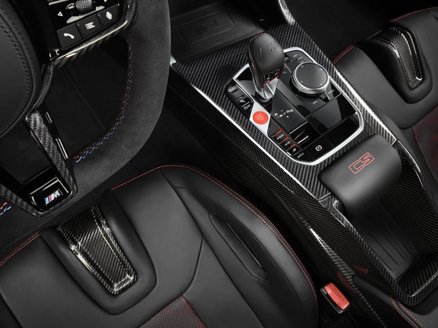 ในห้องโดยสาร M4 CS ใหม่ มุ่งมอบประสบการณ์ที่ดีที่สุดให้กับผู้ขับขี่ในทุกภารกิจ ด้วยพวงมาลัย M Alcantara แบบสามก้านตัดขอบล่าง ที่ไม่เพียงจับถนัดมือแต่ยังแต่งแต้มด้วยองค์ประกอบที่ได้แรงบันดาลใจมาจากสนามแข่ง เช่น เครื่องหมายสีแดงแทนจุดกึ่งกลางของพวงมาลัย และแป้นเปลี่ยนเกียร์ที่ทำจาก CFRP