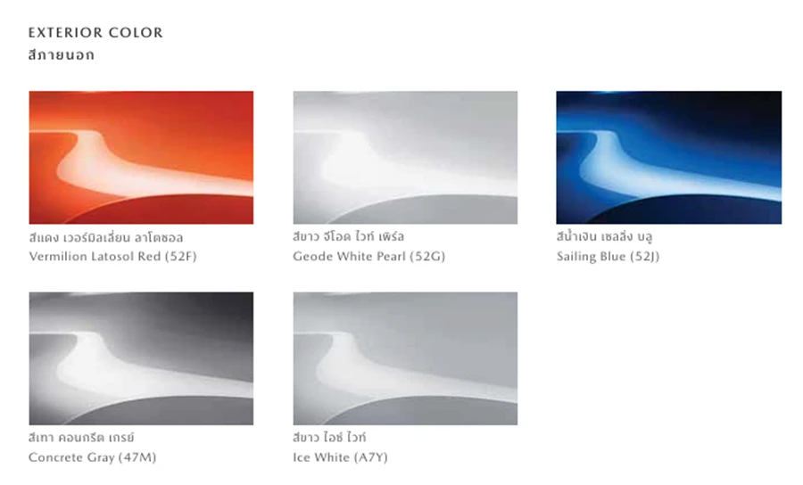 ทั้งยังมาพร้อมสีภายนอก 5 สี ได้แก่ สีขาว ไอซ์ ไวท์, สีเทา คอนกรีต เกรย์ พร้อม 3 สีใหม่ ได้แก่ สีขาว จีโอด ไวท์ เพิร์ล สีน้ำเงิน เซลลิ่ง บลู และ สีแดง เวอร์มิลเลี่ยน ลาโตซอล เรด สีใหม่ที่เปิดตัวในรถรุ่นนี้เป็นครั้งแรก
