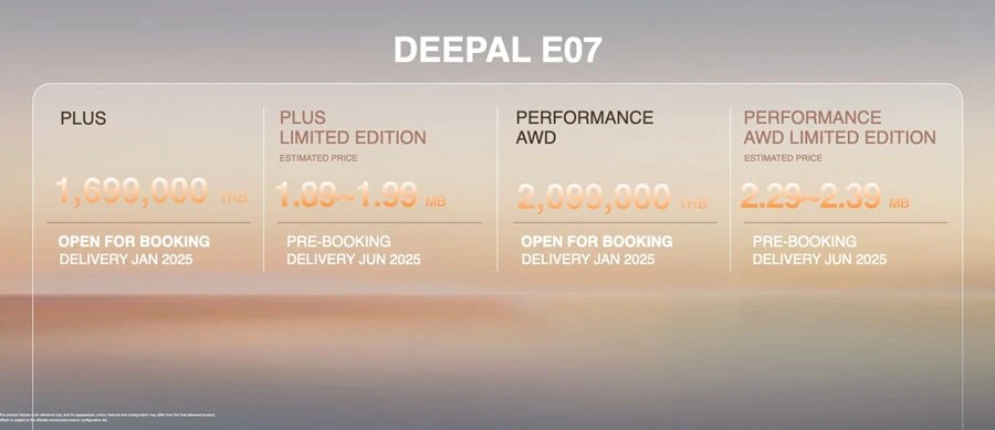 - พิเศษสำหรับผู้ที่จอง 500 ท่านแรก รับราคาเปิดตัวพิเศษ DEEPAL E07 Performance AWD ราคา 1,999,000 บาท พร้อมรับ Special Gift: เลือกรับไลฟ์สไตล์แพ็คเกจOutdoor Explorer Pack หรือ Bike & Beyond Kit มูลค่า 60,000 บาท