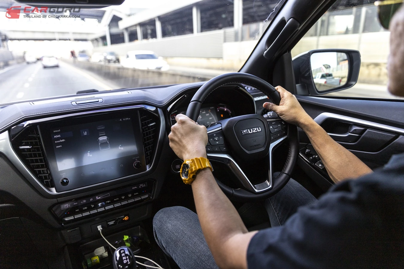 การขับบนถนนจริงครั้งนี้ได้ขับรุ่น D-MAX Hi-Lander 4-Door 2.2 Ddi M A/T ลองทั้งในและนอกเมืองผสมผสานเป็นระยะทางรวมกว่า 300 กม. เสมือนการใช้งานจริงในชีวิตประจำวัน โดยในเมืองขับแบบเช้าเข้าเมือง (ราชประสงค์ - สีลม - สาทร) เย็นขับกลับออกมาชานเมือง (หลักสี่ - ดอนเมือง) อยู่ 2 วัน และนอกเมือง กรุงเทพฯ - ชลบุรี 1 วัน ในส่วนของการขับในเมืองทั้งสองวันที่มักใช้ความเร็วต่ำ สลับหยุดนิ่งบ่อย ด้วยสภาพการจราจรและเส้นทาง พบว่าตัวรถยังคงตอบโจทย์ความสบายภายในห้องโดยสารเหมืนเดิม การขับแบบใช้ความเร็วปานกลาง-ต่ำ สลับหยุดนิ่ง เกียร์ 8 สปีด มีบทบาทเป็นอย่างมากที่ช่วยให้การขับเคลื่อนย่านนี้เนียนและสมูธมากขึ้น เพราะช่วง 0-30 กม./ชม. เกียร์มักชิฟต์ขึ้น-ลงบ่อยครั้ง ตลอดจนช่วงลดความเร็วและเติมคันเร่ง ซึ่งทำได้ดีกว่ารุ่นเดิมชัดเจน อย่างไรก็ตามยังพอมีอาการรอบต่อของเกียร์ในช่วงนี้ให้รู้สึกชัด พร้อมกับรอบที่เร่งขึ้นตามจังหวะ การให้น้ำหนักคันเร่งจึงมีผลพอสมควร ต้องอาศัยความคุ้นชินไปสักพัก แต่ถ้าเร่งไปทีเดียวยาวๆ ขึ้นไป เครื่องยนต์กับเกียร์จะตอบสนองได้ดีมากๆ ก็นับว่าเร่งดีและเนียน แต่ช่วงคลานความเร็วต่ำยังพอรู้สึกกระตุกถึงรอบที่เปลี่ยน จริงๆ ก็เป็นเรื่องธรรมดาของรถกระบะดีเซลเทอร์โบ ซึ่งดีแมคซ์ เครื่อยนต์ 2.2 แม็กฟอร์ช จัดว่าทำได้ดีพอแล้ว อย่างไรก็ตามเรื่องของช่วงล่างของ อีซูซุ ดีแมคซ์ แม็กฟอร์ช ใหม่ (เคลมว่าเหมือนเดิม) กับถนนในกรุงเทพฯ ยังเป็นความไม่ชินของคนที่ไม่เคยนั่งรถกระบะมาก่อน เพราะอาการสั่นสะเทือนจากแชสซีส์จะชัดเจนมาก