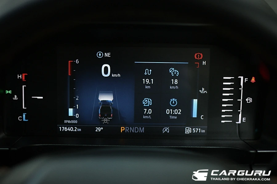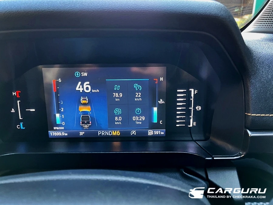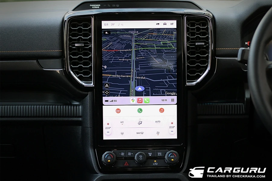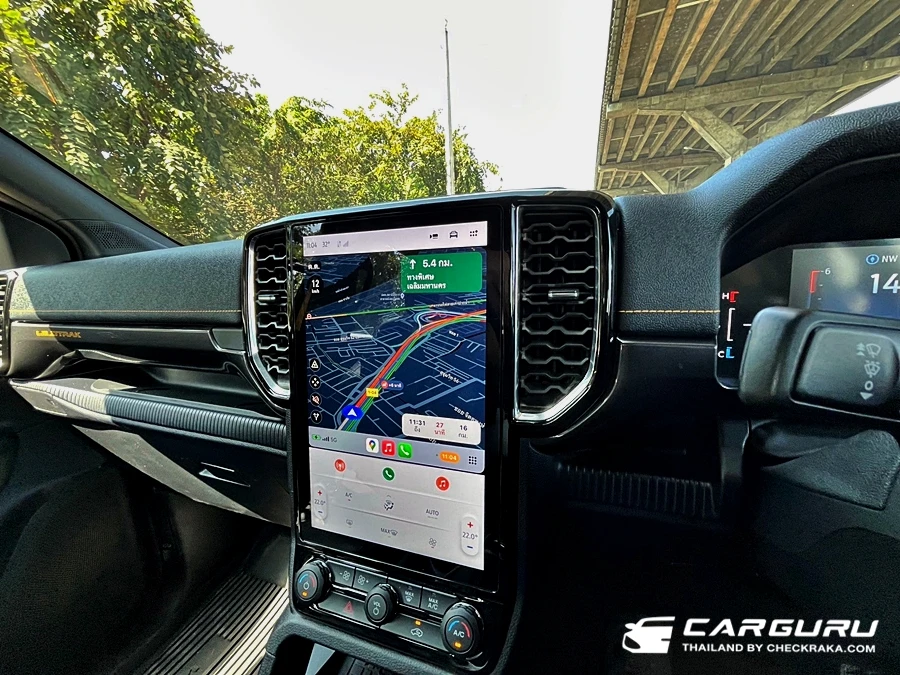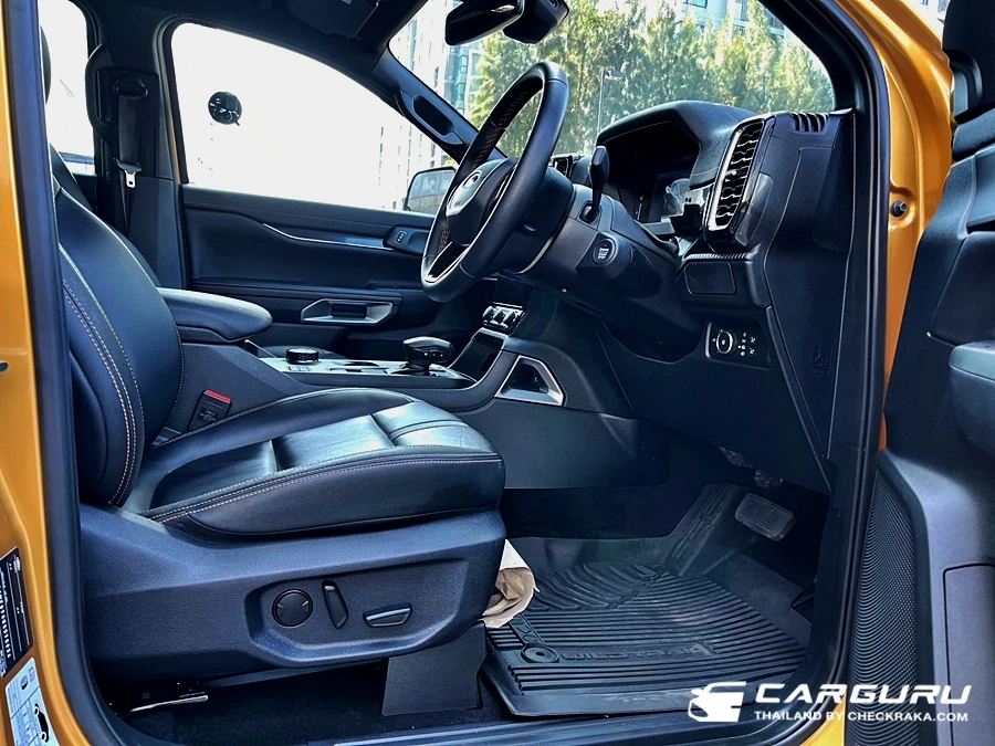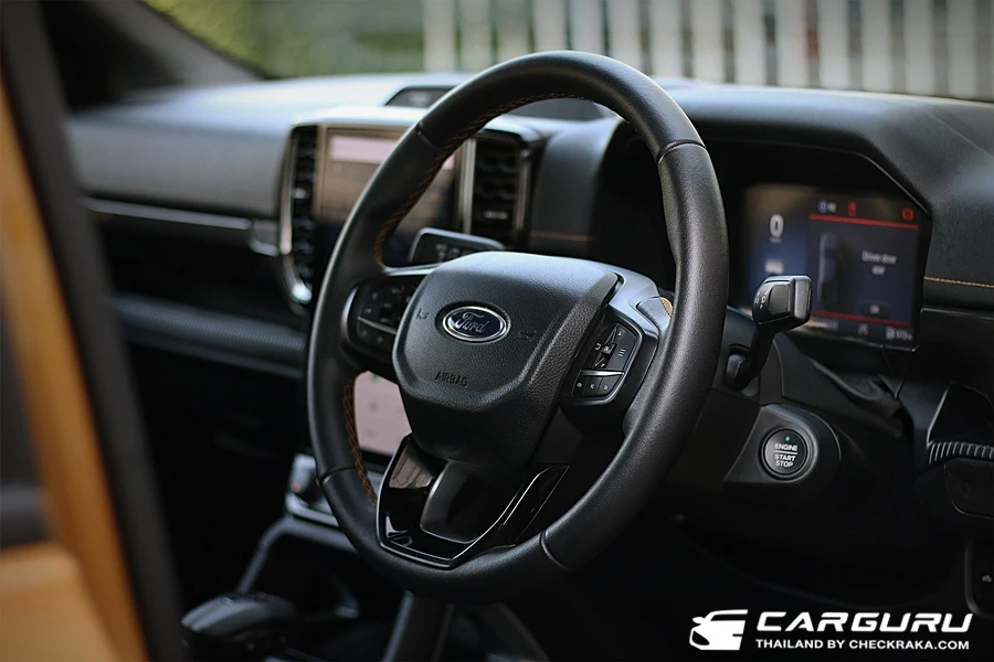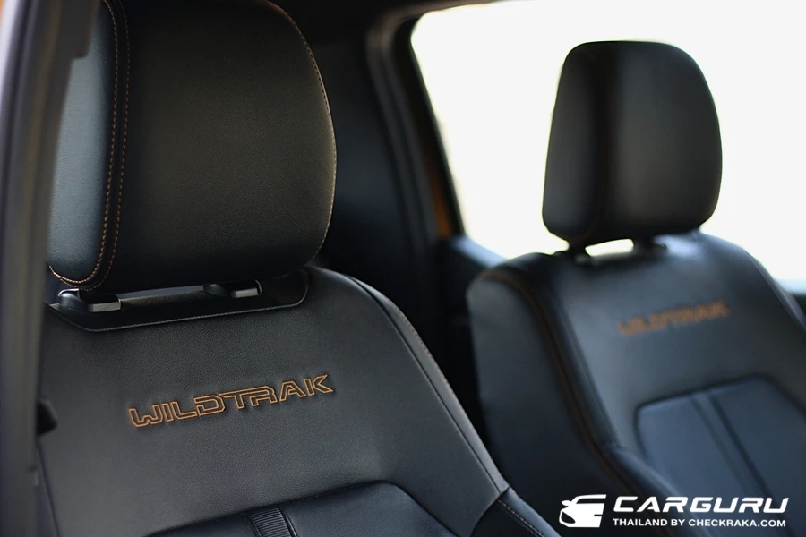 ส่วนภายในก็มีการตกแต่งในสไตล์ Wildtrak เบาะคู่หน้าปรับไฟฟ้า 8 ทิศทาง ส่วนตัวรู้สึกว่าตรงเบาะนี่เองนั่งไม่สบายเท่าไหร่เพราะผิวสำผัสแข็งไปนั่งนาน ๆ มีแอบเมื่อย ต้องขยับตัวเปลี่ยนท่าบ่อย ๆ หน้าจอแสดงผลบนหน้าปัดแบบสีขนาด 8 นิ้ว แสดงฟังก์ชั่นใช้งานต่าง ๆ มองง่ายชัดเจนดี ยิ่งการแสดงระบบช่วยเหลือการขับขี่ ดูง่ายไม่ซับซ้อน ระบบปรับอากาศแบบอัตโนมัติแยกอิสระซ้าย-ขวาและช่องแอร์สำหรับผู้โดยสารตอนหลัง หน้าจอแสดงผลจอสีแบบสัมผัส Multi-Touch ขนาด 12 นิ้ว รองรับการเชื่อมต่อแบบไร้สาย Apple CarPlay® and Android AutoTM ระบบเชื่อมต่อบลูทูธ และ ระบบสั่งงานด้วยเสียง SYNC® 4A และลำโพง 6 ตำแหน่ง