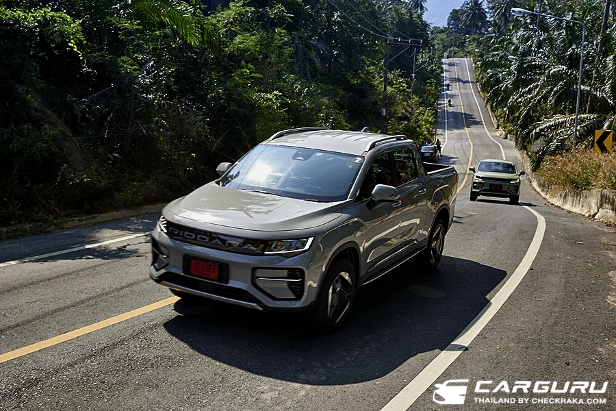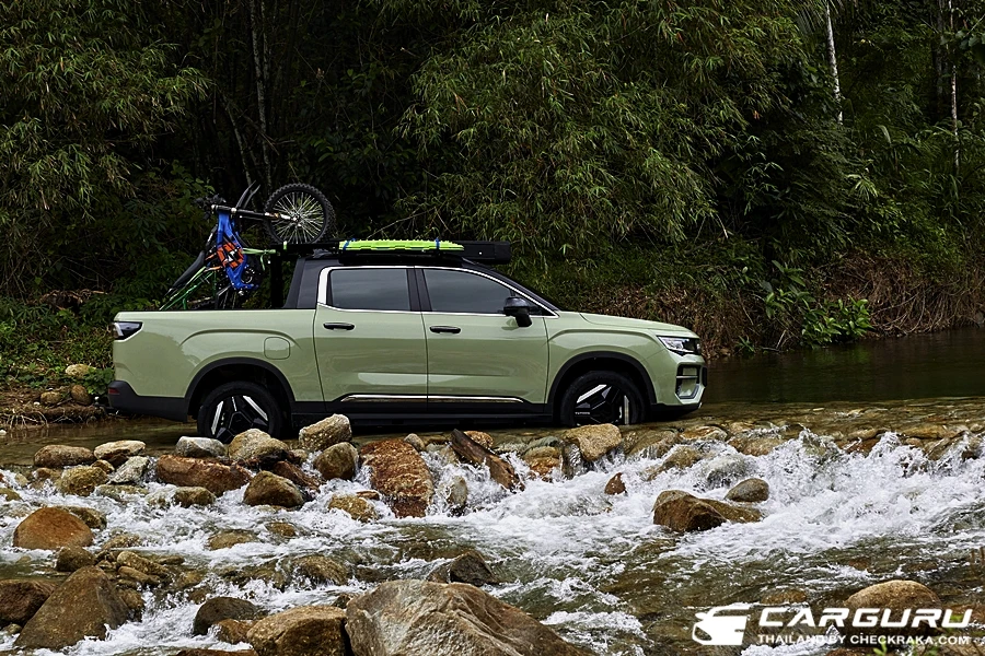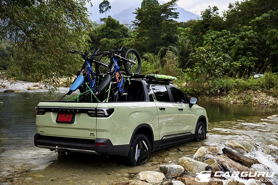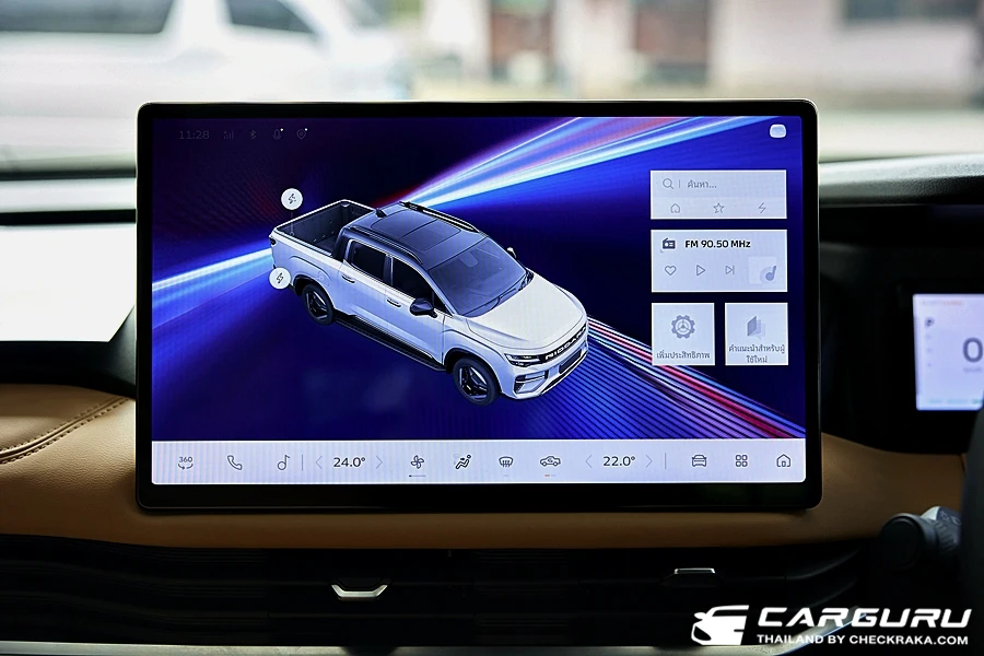 พร้อมช่องแอร์ด้านหลัง, แท่นชาร์จโทรศัพท์มือถือแบบไร้สาย 50W ช่อง USB-A และที่วางแก้วน้ำ ที่เท้าแขนมือจับ 3 ตำแหน่ง โดยรวมแล้วการออกแบบทั้งคัน เหมือนรถเก๋งมากกว่ากระบะ ดูทันสมัยแบบรถยนต์ SUV ไฟฟ้า ถึงกล้าบอกว่านี่คือรถ SUV ไฟฟ้าที่มีท้ายเป็นกระบะนี่เองครับ