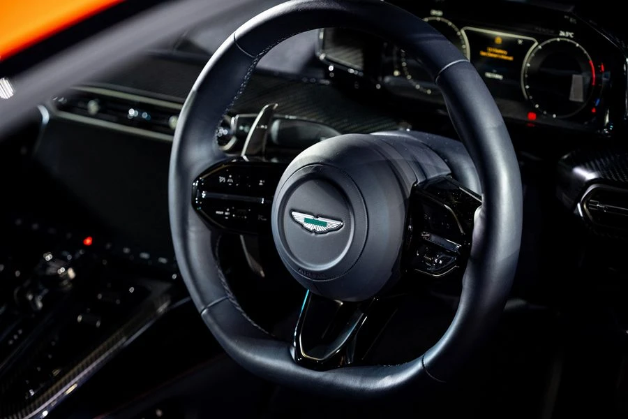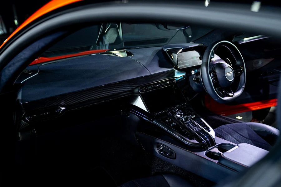 ห้องโดยสารได้รับการออกแบบใหม่ทั้งหมด ผสมผสานความหรูหรากับเทคโนโลยีล้ำสมัย ตกแต่งด้วย หนังแท้ Bridge of Weir ที่ให้สัมผัสหรูหราและกลิ่นหอมเป็นเอกลักษณ์ มาพร้อมระบบเสียงมาตรฐาน Aston Martin 390W 11 ลำโพง พวงมาลัยพาวเวอร์แบบไฟฟ้า แปรผันอัตโนมัติ (Variable Electrical Power Assistance) ทัชสกรีนอเนกประสงค์ Pure Black ขนาด 10.25 นิ้ว