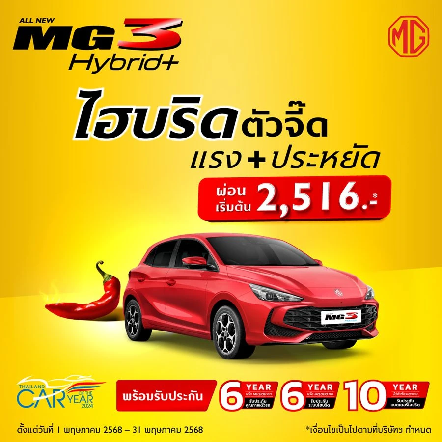 [1] ดาวน์เริ่มต้น 8,888 บาท หรือดาวน์เริ่มต้น 5% สำหรับข้าราชการ พนักงานรัฐวิสาหกิจ หรือพนักงานบริษัท ที่มีอายุงานอย่างน้อย 1 ปี และมีรายสุทธิหลังหักค่าใช้จ่ายเกินกว่า 2 เท่าของค่างวด หรือเลือกผ่อนเริ่มต้น 2,516 บาท คำนวณจาก ALL NEW MG3 HYBRID+ รุ่นย่อย D เมื่อดาวน์ 25% ผ่อนชำระนาน 84 เดือน (หลังหักช่วยผ่อน 4,000 บาทใน 6 เดือนแรก, เดือนที่ 7 – 84 ผ่อนชำระเดือนละ 6,516 บาท)