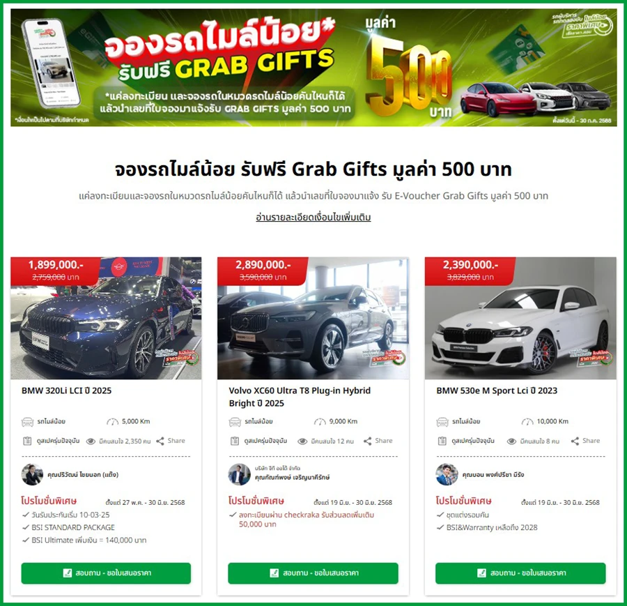 พิเศษสำหรับลูกค้าของ Checkraka กับกิจกรรมจองรถไมล์น้อยวันนี้ รับฟรี Grab Gifts มูลค่า 500 บาท “ทั้งรถไมล์น้อย, รถผู้บริหาร รถทดลองขับและรถ Demo ที่อยู่ในหน้ารถไมล์น้อยราคาพิเศษ” รับสิทธิพิเศษง่ายๆ เพียงแค่ลงทะเบียนและจองรถในหมวดรถไมล์น้อยราคาพิเศษ แล้วนำเลขที่ใบจองมาแจ้ง รับ E-Voucher Grab Gifts มูลค่า 500 บาทฟรีๆ ไปได้เลย ตั้งแต่วันนี้ - 31 กรกฎาคม 2568