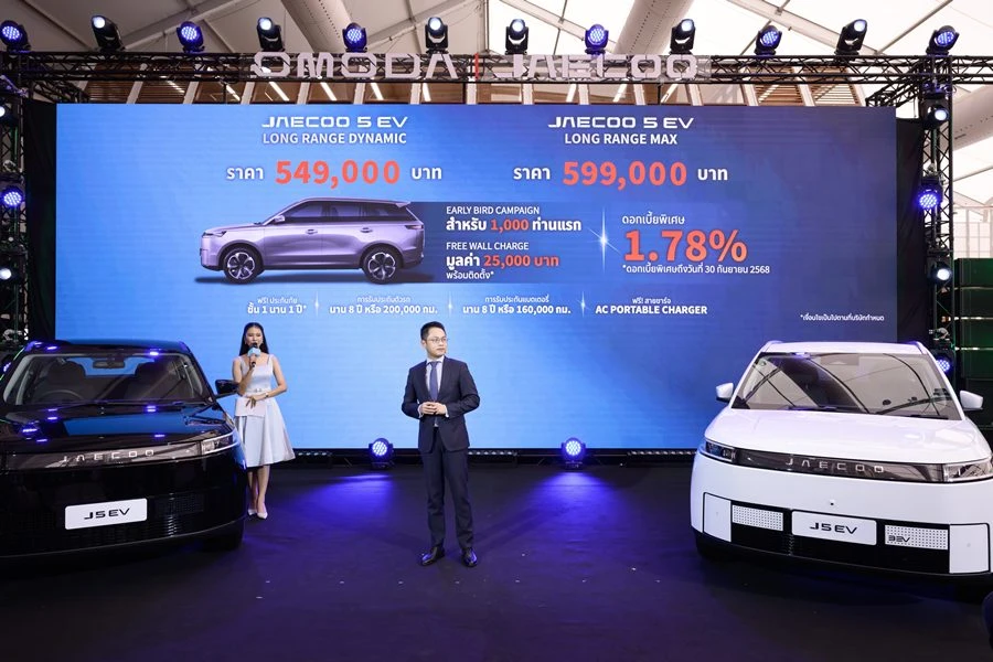 พิเศษสำหรับลูกค้า JAECOO 5 EV 1,000 ท่านแรก ที่จองและรับภายใน 30 กันยายน 2568 รับข้อเสนอสุดพิเศษ ราคาเริ่มต้นที่ 549,000 บาท สำหรับรุ่น JAECOO 5 EV Long Range Dynamic และราคาเริ่มต้นที่ 599,000 บาท