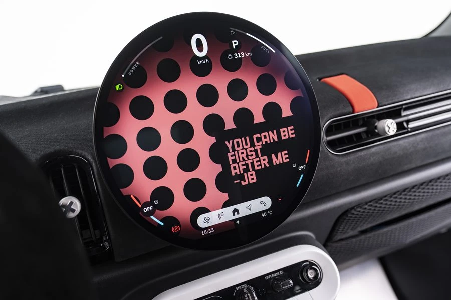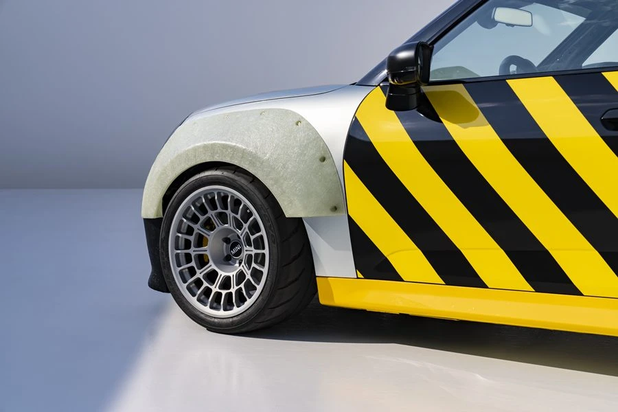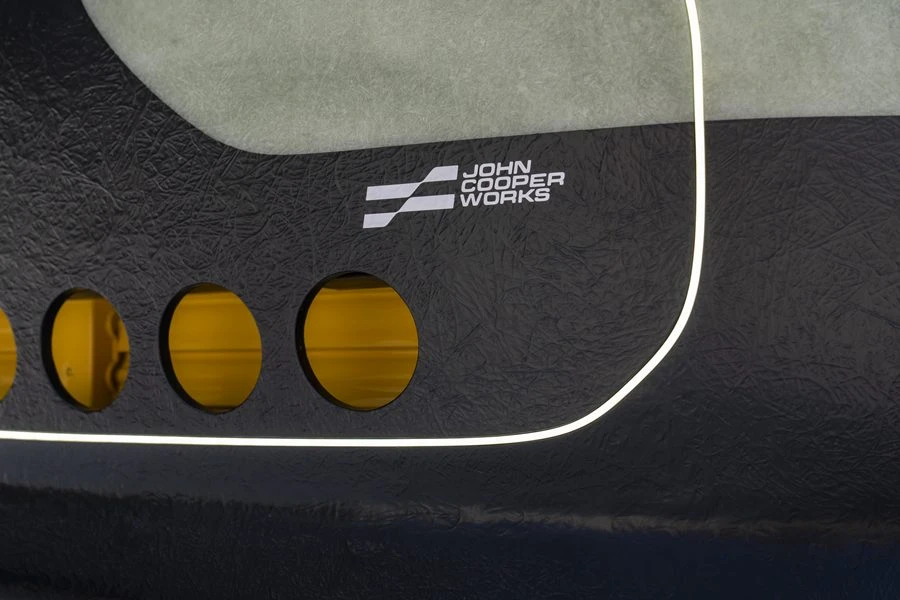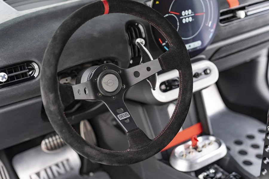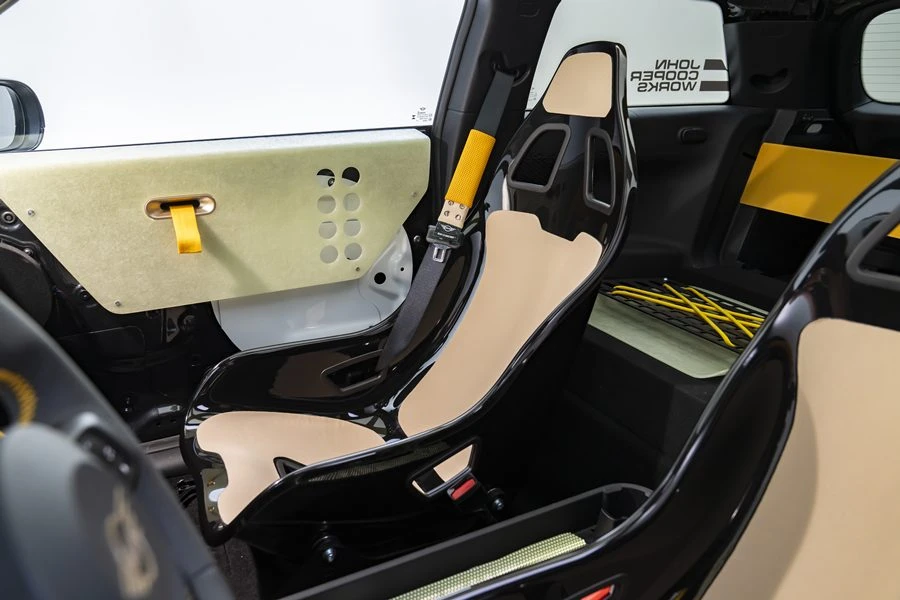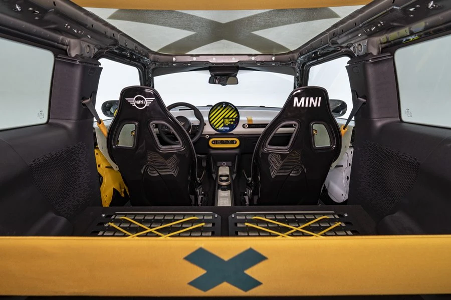 และด้วยดีไซน์ที่เน้นการลดน้ำหนักในทุกพื้นผิว ตั้งแต่แผงประตูหลังพร้อมลาย 'X' สีขาวโดดเด่น ไปจนถึงแผงหน้าปัดผ้าเคลือบแว็กซ์ น้ำหนักเบา ทนทาน และเคลือบด้วยสีแพทิน่าที่บ่งบอกถึงฝีมือของช่าง ส่วนโรลเคจที่เปิดโล่งช่วยเพิ่มทั้งโครงสร้างและเอกลักษณ์เฉพาะตัวนับเป็นอุปกรณ์ความปลอดภัยที่สะท้อนถึงดีเอ็นเอรถแข่งอันไร้การปรุงแต่งของรถ ระบบควบคุมต่าง ๆ ของรถไม่ว่าจะเป็นสวิตช์และปุ่มทุกปุ่มได้รับการออกแบบให้ทำงานได้อย่างเป็นธรรมชาติและเชื่อถือได้ แม้ในสภาวะที่รุนแรง ไม่มีเมนูที่ซับซ้อน และเบรกมือไฮดรอลิกพร้อมคันโยกขนาดใหญ่ แสดงถึงความมุ่งมั่นในความแม่นยำและการควบคุมรถ และนี่เป็นการยกย่อง DNA ของมอเตอร์สปอร์ตของแบรนด์ MINI