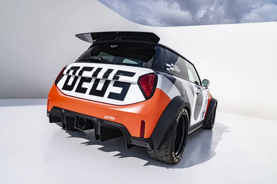 ขณะที่ไฟหน้าอีกสี่ดวงที่ติดตั้งบนฝากระโปรงหน้า สะท้อนถึงรากฐานของกีฬาแรลลี่ ชุดไฟแบบสั่งทำพิเศษแต่ละชุดตกแต่งด้วยโลโก้ Deus อันเป็นเอกลักษณ์ มอบทั้งสมรรถนะและเอกลักษณ์เฉพาะตัว ด้านหลัง ดิฟฟิวเซอร์ได้รับแรงบันดาลใจจากรถแข่ง MINI JCW ที่โลดแล่นบนสนามแข่ง นอกจากรูปลักษณ์ที่ดุดันแล้วยังได้รับการออกแบบเพื่อเพิ่มประสิทธิภาพการไหลเวียนของอากาศและเสถียรภาพการทรงตัว โดยท่อไอเสียที่ติดตั้งอยู่ตรงกลางทำหน้าที่เป็นทั้งจุดเน้นด้านการใช้งานและความสวยงาม ช่วยขับเน้นเสียงเครื่องยนต์ให้ทรงพลังยิ่งขึ้น