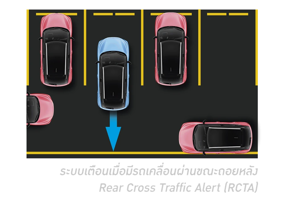 - ระบบเตือนเมื่อมีรถเคลื่อนผ่านขณะถอยหลัง Rear Cross Traffic Alert (RCTA)