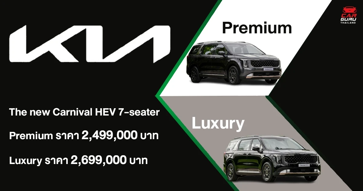 สำหรับ The new Kia Carnival HEV 7-seater มีให้เลือก 2 รุ่นย่อย ได้แก่ The new Kia Carnival HEV 7-seat Luxury ราคา 2,699,000 บาท และ The new Kia Carnival HEV 7-seat Premium ราคา 2,499,000 บาท มาพร้อมการรับประกันคุณภาพนาน 7 ปี บริการช่วยเหลือฉุกเฉิน ฟรี 24 ชม. 7 ปี ไม่จำกัดระยะทาง การรับประกันแบตเตอรีรถยนต์ (High-Voltage Battery) นาน 8 ปี และข้อเสนอพิเศษช่วงเปิดตัว ฟรี ค่าบำรุงรักษาตามระยะ (ค่าแรง และค่าอะไหล่) ตลอด 3 ปี หรือ 30,000 กิโลเมตร พิเศษ! สำหรับเจ้าของรถยนต์เกียและครอบครัว (Kia Loyalty) รับสิทธิ์ฟรี! ค่าบำรุงรักษาตามระยะ (ค่าแรง และค่าอะไหล่) เพิ่มอีก 2 ปี หรือ 20,000 กิโลเมตร รวมเป็น 5 ปี หรือ 50,000 กิโลเมตร ตั้งแต่วันที่ 3 ถึง 31 ตุลาคม 2568 โดย เกีย เซลส์ (ประเทศไทย) พร้อมส่งมอบรถ และเปิดให้ทดลองขับ ณ โชว์รูมเกียทุกสาขาทั่วประเทศ ได้ตั้งแต่วันที่ 3 ตุลาคม 2568 เป็นต้นไป