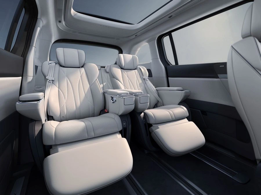 รถตู้ไฟฟ้าทรงสปอร์ตอัจฉริยะรุ่นท็อป ที่มาพร้อมความพิเศษยิ่งขึ้น โดดเด่นด้วยสีภายนอก Matte Gray ครั้งแรกในตลาด MPV ไฟฟ้า สอดรับกับเฉดสีภายในใหม่ Light Gray เบาะหนังแท้แนปป้า (Nappa) ผสานฟังก์ชั่น Zero-gravity Seat หรูหรามีระดับ เบาะนั่งแถวสองปรับไฟฟ้า 18 ทิศทาง พร้อมที่ชาร์จแบบไร้สาย 50 วัตต์