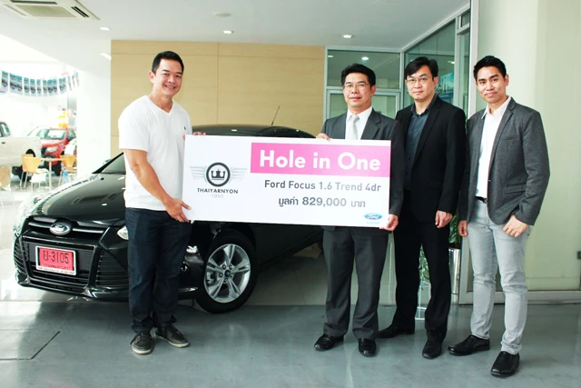 บจก.ไทยยานยนตร์ เซลส์แอนด์เซอร์วิส ผู้แทนจำหน่ายรถยนต์ระดับชั้นแนวหน้า ได้แก่ BMW, Ford, Mazda, Mitsubishi และ Nissan ในกลุ่มไทยยานยนตร์ มอบรางวัลรถยนต์ Ford รุ่น Focus 4 ประตู Ti-VCT Trend AT มูลค่า 829,000บาท ให้แก่ นายต่อพงษ์ พงศ์ศิวาภัย (คนที่ 1 จากซ้าย) ผู้คว้ารางวัล Hole in One หลุม 15 ในการแข่งขันกอล์ฟประจำปี รายการ Golf Annual Round-Up ของสมาชิกสมาคมราชกีฬาสโมสร (The Royal Bangkok Sport Club : R.B.S.C.) ณ โชว์รูมและศูนย์บริการฟอร์ด ไทยยานยนตร์ สาขารามคำแหง