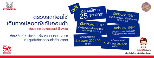 ตั้งแต่วันที่ 1 มีนาคม ถึง 20 เมษายน 2558 ฮอนด้า ชวนตรวจรถก่อนใช้ เพื่อความปลอดภัยช่วงสงกรานต์ โดยเปิดรับบริการตรวจเช็คฟรี 25 รายการ พร้อมรับส่วนลด 20 เปอร์เซ็นต์ เมื่อซื้อแพคเกจเช็คระยะฮอนด้าเพย์เซฟ (4 ระยะทาง), เปลี่ยนยางรถยนต์หรือแบตเตอรี่ รับส่วนลด 200 บาทต่อเส้นหรือลูก และรับส่วนลด 10 เปอร์เซ็นต์ เมื่อซื้อโปรแกรมฮอนด้าอัลติเมทแคร์ (อัลติเมท2,3) หรือผ้าเบรก/จานเบรก/แม่ปั๊มเบรก/หม้อลมเบรก/สายอ่อนเบรก*
