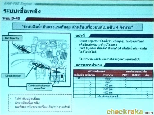 อัตราเร่งช่วงออกตัว จากพละกำลัง 167 แรงม้า ผสานกับเกียร์อัตโนมัติ 6 สปีด ใหม่ ทำให้ตัวรถสามารถดีดตัวออกได้อย่างกระฉับกระเฉงและเร่งความเร็วได้ราบรื่น ด้านระบบจ่ายน้ำมันช่วงเดินเบา-รอบต้นเป็นการจ่ายผ่านพอร์ตไอดี เมื่อเติมคันเร่งมากขึ้นเรื่อยๆ จนถึงช่วงรอบระดับ 2,500 รอบ/นาที ยังรู้สึกได้ถึงการดึงจากแรงบิด ส่วนการสั่งจ่ายน้ำมันในช่วงนี้ เป็นการยิงเข้าห้องเผาไหม้โดยตรงอย่างเดียว จากนั้นจึงลองใช้ Paddle Shift เพื่อลากรอบให้สูงขึ้นปรากฎว่าเสียงเครื่องยนต์แผดดังให้ได้ยินชัดเจน การจ่ายน้ำมันในช่วงรอบสูงเป็นการยิงทั้งที่พอร์ตและห้องเผาไหม้ เพื่อป้อนน้ำมันให้เพียงพอ นับเป็นจุดเด่นของเครื่องยนต์ยนต์ใหม่ 6AR-FSE ที่เปี่ยมไปด้วยประสิทธิภาพจากระบบ VVT-iW & D-4S