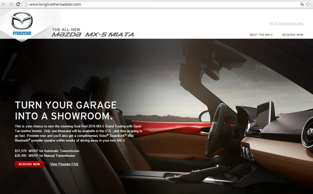 มาสด้า MX-5 Miata ใหม่ พร้อมเปิดรับจองแบบพรีออร์เดอร์ในสหรัฐอเมริกา โดยจำกัดแค่ 1,000 คัน มีเฉพาะสีแดง โซล เรด (Soul Red) ส่วนภายในห้องโดยสารใช้หนังสีแทน สปอร์ต นับเป็นการคัดสรรมาเพื่อการเปิดจองแบบจำกัดจำนวน พิเศษก่อนใคร