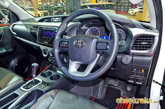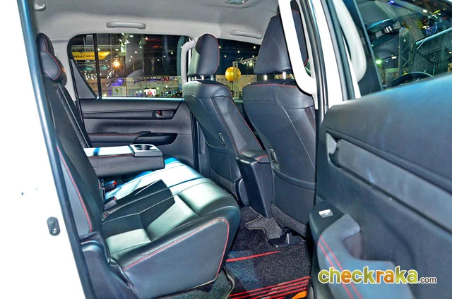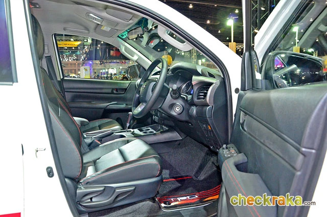 ภายในของโตโยต้า ไฮลักซ์ รีโว่ ทีอาร์ดี แตกต่างเพิ่มอีกหลายส่วน เช่น เบาะหนังแท้สีดำเย็บด้วยด้ายสีแดง รวมทั้งหัวเกียร์และแผงข้างกระตู ชุดพรมปูพื้น TRD