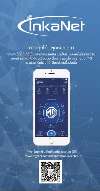 ไฮไลท์เด่นของเอ็มจี6 ใหม่ คือ inkaNet ระบบการสื่อสารอัจฉริยะระหว่างผู้ขับกับรถยนต์เอ็มจี ระบบแรกในตลาด ทำงานบนเครือข่ายโทรศัพท์ไร้สาย inkaNet ประกอบด้วย 5 ฟังก์ชั่นหลัก ได้แก่ ฟังก์ชั่นตรวจสอบสถานะการทำงานของรถ เช่น ระยะทางที่วิ่ง ระดับน้ำมัน ระดับไฟในแบตเตอรี่ แบบเรียลไทม์ ฟังก์ชันควบคุมการทำงานของรถระยะไกล ฟังก์ชันวิเคราะห์การทำงานของตัวรถ ฟังก์ชันแจ้งเตือนความผิดปกติ และฟังก์ชันติดตามรถแบบเรียลไทม์ สามารถบอกตำแหน่งรถ พร้อมแนะนำเส้นทางจราจรที่สะดวกสุด *พิเศษสำหรับลูกค้า เอ็มจี6 ใหม่ รับสิทธิพิเศษเชื่อมต่อระบบ inkaNet ผ่านเครือข่ายโทรศัพท์มือถือฟรีนาน 5 ปี