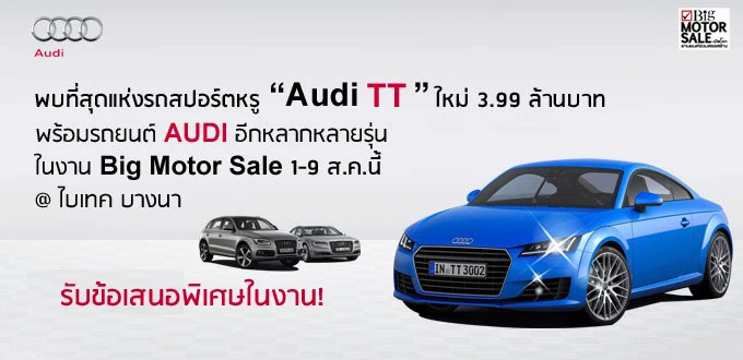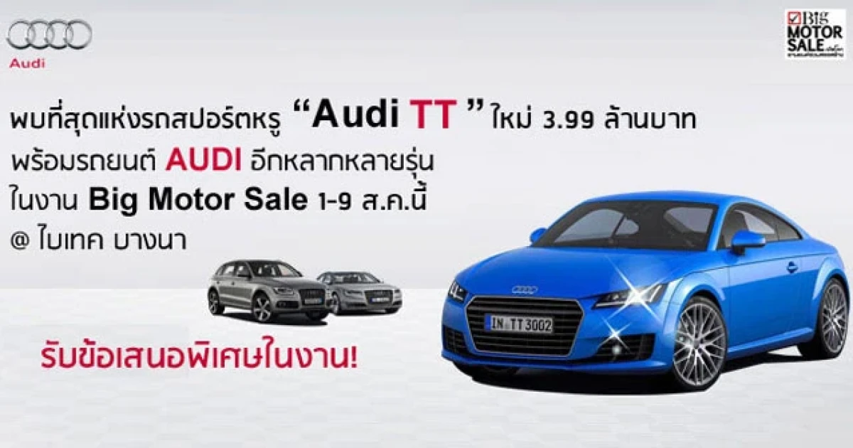 พบที่สุดแห่งความสปอร์ต รถยนต์ออดี้ ทีที 2.0 ทีเอฟเอสไอ ทั้งแรงระดับ 230 แรงม้า และประหยัด พร้อมระบบขับเคลื่อน 4 ล้อ Quattro นำเข้าทั้งคันจากประเทศเยอรมนีแท้ๆ ไม่ต้องปวดหัวเรื่องความจุกจิกกวนใจ ... เพราะผลิตเพื่อประเทศไทยโดยเฉพาะ! ในราคาสุดคุ้ม 3.99 ล้านบาท ในงาน BIG MOTOR SALE 2015 ระหว่างวันที่ 1 - 9 สิงหาคมนี้ ที่ไบเทค บางนา