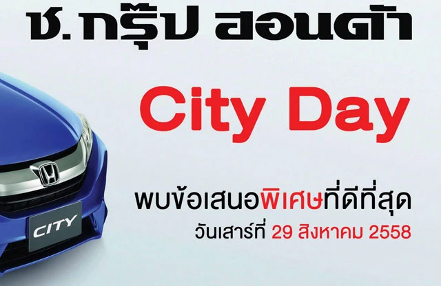 บริษัท ช.กรุ๊ป ฮอนด้า ออโต้โมบิล จำกัด จัดหนักจัดเต็มสวนกระแสเศรษฐกิจ! มอบข้อเสนอพิเศษสำหรับผู้ที่สนใจ ฮอนด้า ซิตี้ ทุกรุ่น ในงาน "HONDA CITY DAY" วันที่ 29 สิงหาคม 2558 วันเดียวเท่านั้น! เฉพาะเวลา 09.00 - 12.00 น.