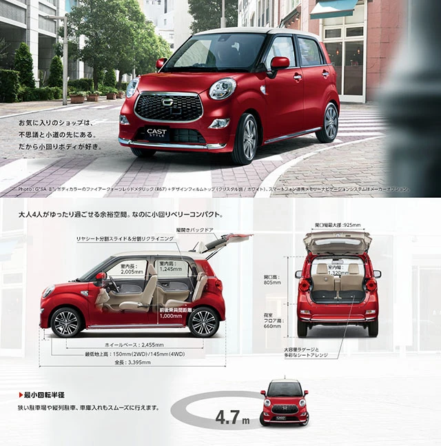 - Daihatsu Cast Style X 2WD มีราคาจำหน่ายที่ 1,220,400 เยน และรุ่นที่แพงสุดอย่าง G Turbo SA II 4 WD ราคา 1,641,600 เยน