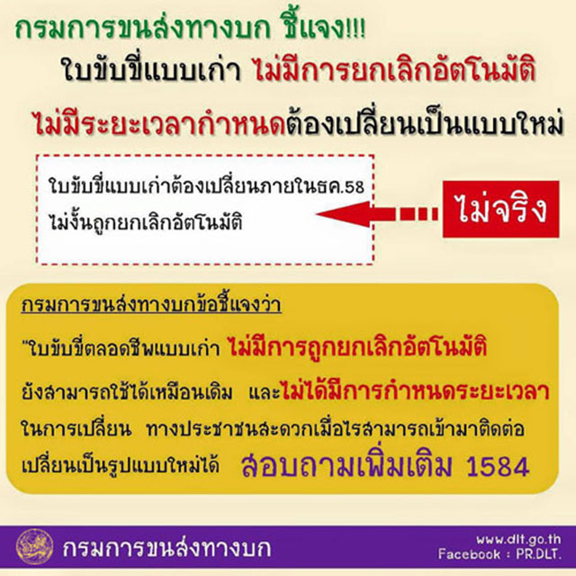 กรมการขนส่งทางบกชี้แจง ไม่มีการยกเลิกใบขับขี่ตลอดชีพแบบเก่า กรณีที่มีข่าวหรือแชร์กันในกระแสโซเชียลเน็ตเวิร์คนั้นว่าไม่เป็นความจริง ดังนั้นใบขับขี่ตลอดชีพยังคงใช้ได้ตลอด และหากต้องการเปลี่ยนบัตรเป็นรุ่นใหม่ สามารถเข้ารับบริการเปลี่ยนได้ทันที