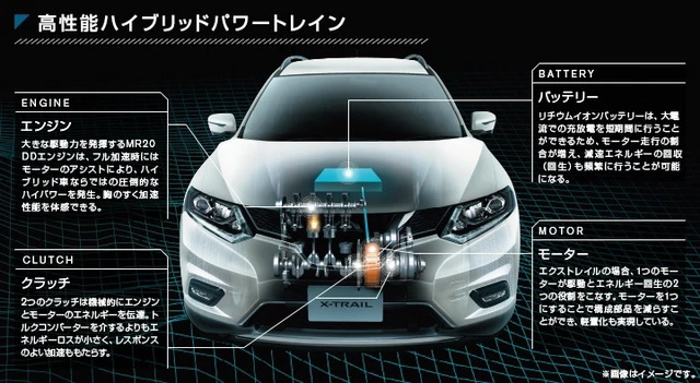 นิสสัน เผยเทคโนโลยีไฮบริดใน Nissan X-trail Hybrid ครั้งแรกในประเทศไทยให้บรรดาแฟนๆ ได้ยลโฉมก่อน Motor Expo 2015 โดยรูปลักษณ์ภายนอกและภายในใช้พื้นฐานเดียวกับรุ่นเครื่องยนต์สันดาปที่มีขายอยู่ในปัจจุบัน อาจแตกต่างกันในรายละเอียดบางจุด แต่สิ่งที่โดดเด่นก็คือ เครื่องยนต์ MR20DD 4 สูบ ความจุ 2.0 ลิตร 147 แรงม้า ผสานกับระบบมอเตอร์ไฟฟ้าขนาด 41 แรงม้า ผ่านชุดส่งกำลังแบบใหม่แทนที่ CVT นั่นคือ "Intelligent Dual Clutch" ระบบคลัตช์คู่ที่ทำงานได้ฉลาดและฉับไว ส่วนแบตเตอรี่เป็นแบบ "lithium-ion" พร้อมฟังก์ชันชาร์จเร็ว และมีอัตราสิ้นเปลืองที่เคลมจากโรงงานที่ประเทศญี่ปุ่นอยู่ที่ 20.6 กิโลเมตรต่อลิตร