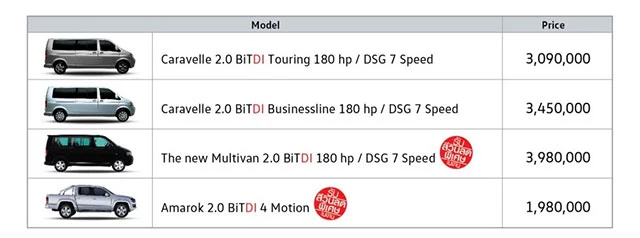 - Absolute Worry Free ฟรีค่าซ่อม ค่าแรง ค่าอะไหล่ ค่าบำรุงรักษาตามระยะทาง 5 ปี /105,000 กิโลเมตร หรืออย่างใดอย่างหนึ่งถึงก่อน (รวมแบตเตอรี่, ยางรถยนต์, ใบปัดน้ำฝน) แคมเปญนี้นับเวลาตั้งแต่ออกรถ ครอบคลุมระยะเวลา 5 ปี พร้อมฟรีค่าใช้จ่ายในการดูแลรักษารถเฉพาะรุ่น Caravelle Businessline, Caravelle Touring และ Multivan