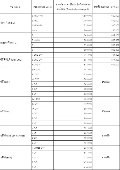 โครงสร้างภาษีสรรพสามิตใหม่ มีผลต่อการปรับเปลี่ยนราคารถยนต์ฮอนด้ารุ่นต่างๆ ที่ออกจากโรงงานผลิตตั้งแต่วันที่ 1 มกราคม 2559 ตามตารางนี้