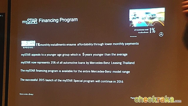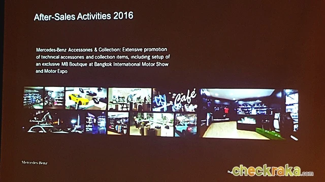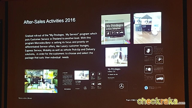 แคมเปญพิเศษส่งเสริมการขายที่ร่วมมือกับบริษัท เมอร์เซเดส เบนซ์ ลีสซิ่ง (ประเทศไทย) จำกัด นำเสนอผลิตภัณฑ์ทางการเงินแบบครบวงจร พร้อมทั้งโปรโมชั่นและข้อเสนอพิเศษสุดสำหรับลูกค้าของเมอร์เซเดส เบนซ์ เท่านั้น รวมถึงมุ่งเน้นพัฒนาบริการหลังการขายให้ดีที่สุดและต่อเนื่อง ด้วยการจัดกิจกรรมเวิร์คช็อปเพื่อพัฒนาบุคคลากรด้านการช่างเพื่อเพิ่มศักยภาพในการดูแลลูกค้าให้แก่ผู้จำหน่ายอย่างเป็นทางการของเมอร์เซเดส เบนซ์ ทั่วประเทศ ซึ่งปัจจุบันเรามีผู้จำหน่ายอย่างเป็นทางการ 31 แห่งทั่วประเทศ โดยแบ่งออกเป็น 16 แห่งในกรุงเทพฯ และปริมณฑล และอีก 15 แห่งในต่างจังหวัด และมีแผนที่จะเปิดโชว์รูมเพิ่มอีก 5 แห่ง ให้ครบ 36 แห่งภายในปี 2560