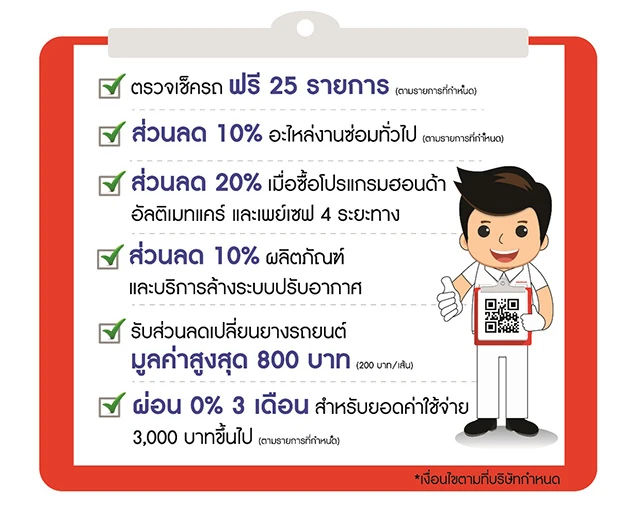 - รายการที่ 1 บริการตรวจสภาพรถยนต์ฟรี 25 รายการ (ตามรายการที่กำหนด)
